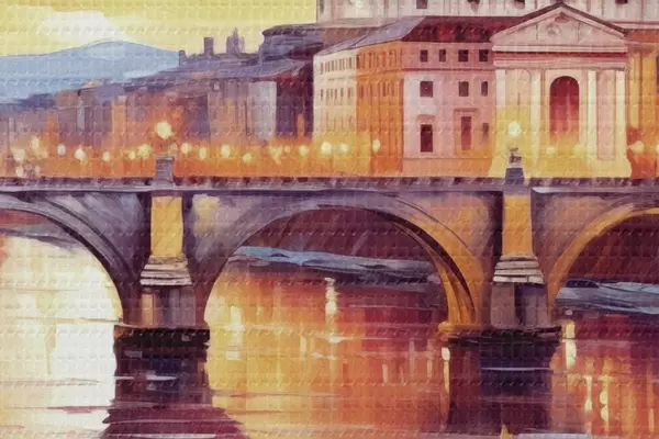 Immagine Basilica di San Pietro e ponte sul fiume al tramonto, colori caldi, riflesso nell'acqua, stile pittura ad olio Nr r43396