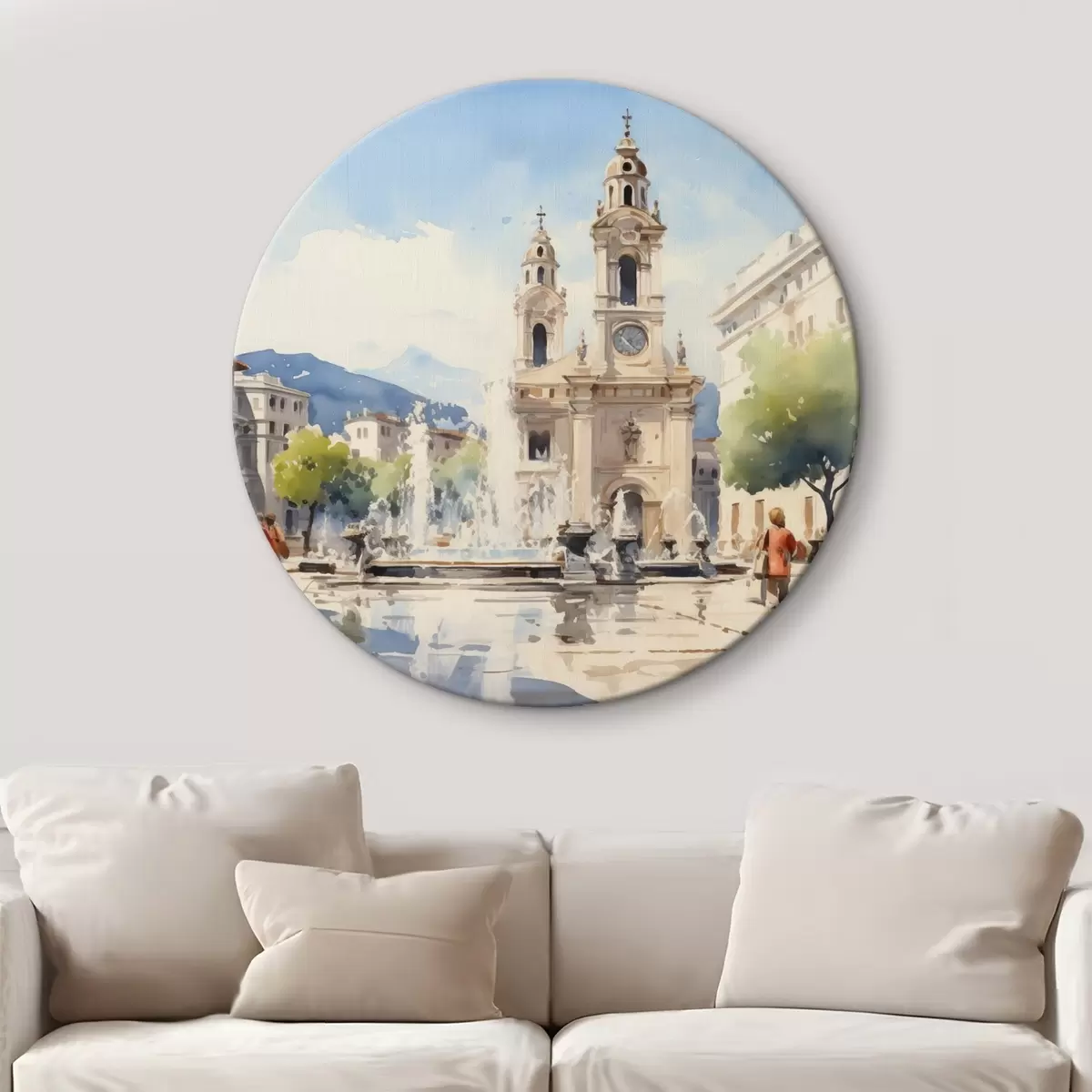 Quadri rotondi Paesaggio urbano astratto con torre e fontana in una piazza, montagne in lontananza, stile acquerello r43397