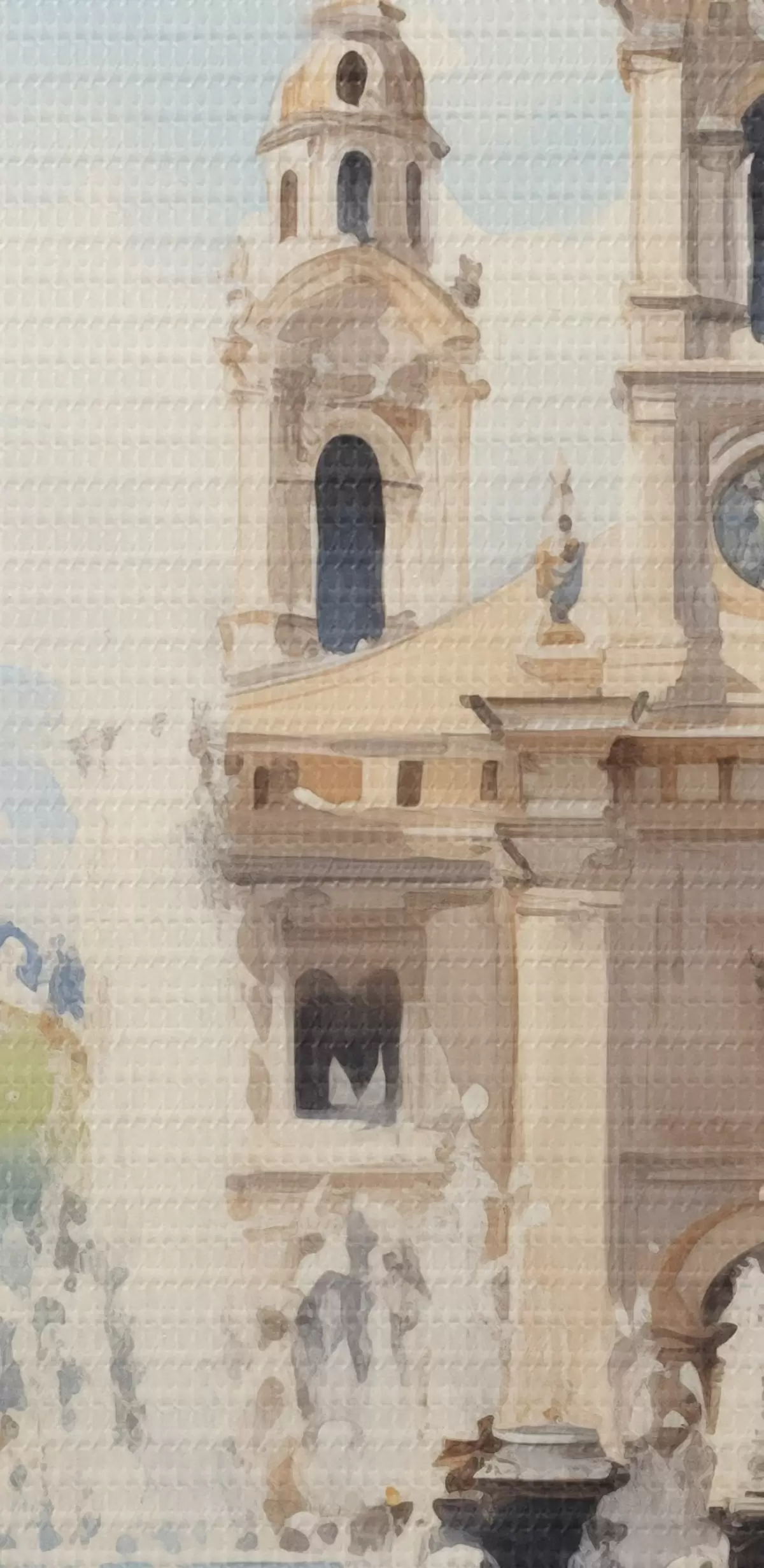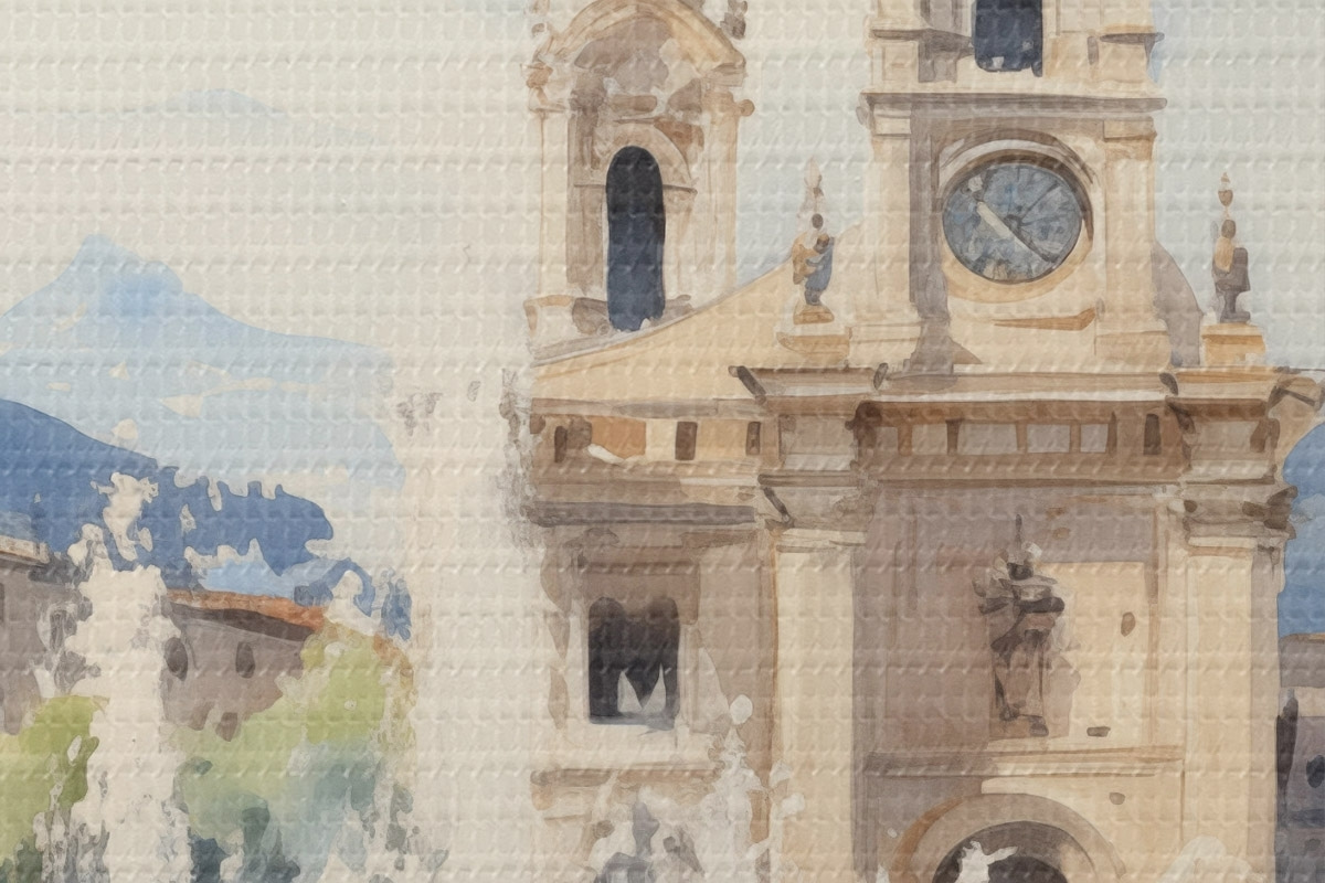 Immagine Paesaggio urbano astratto con torre e fontana in una piazza, montagne in lontananza, stile acquerello Nr r43397