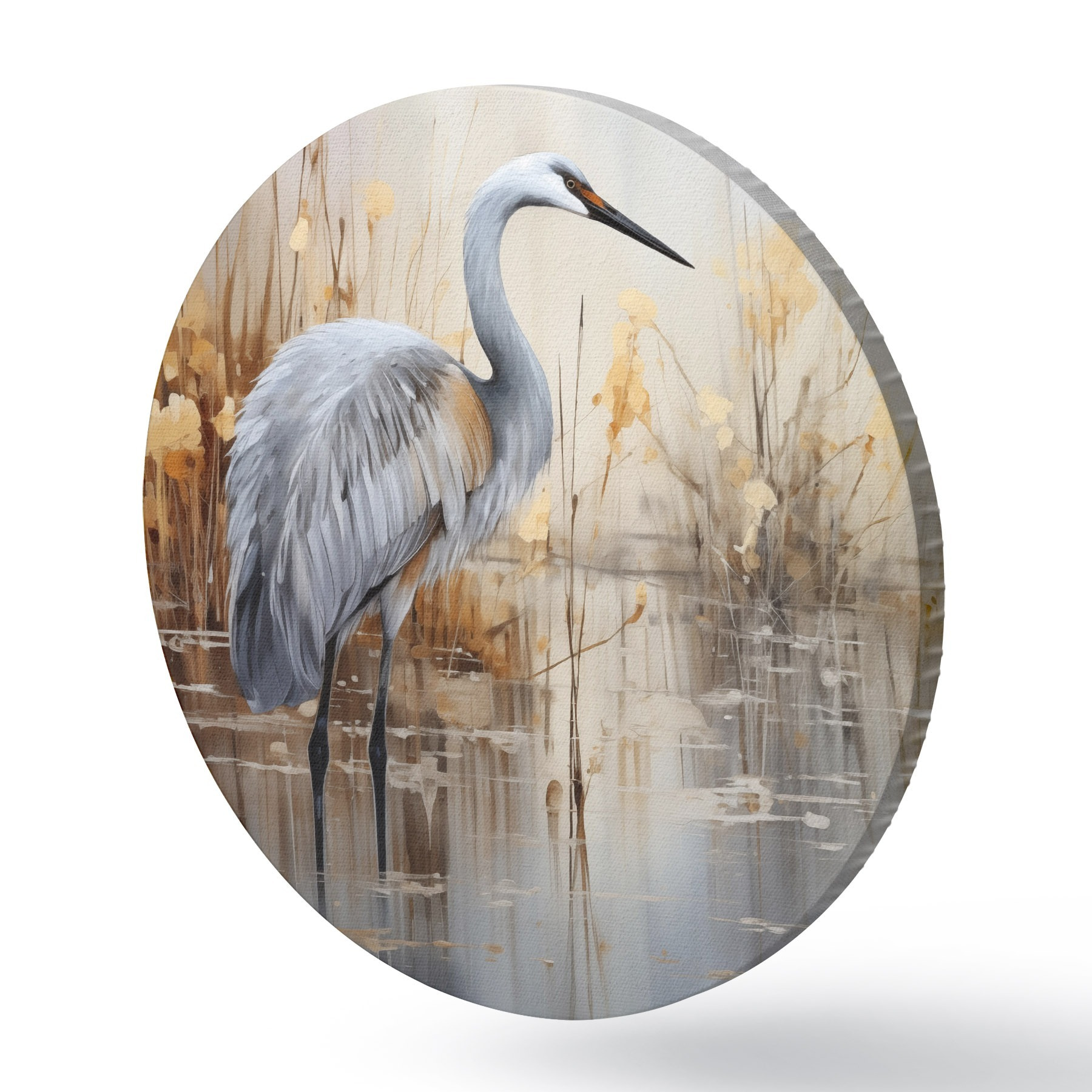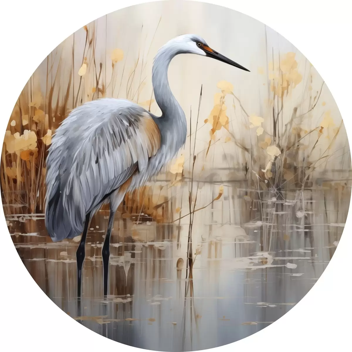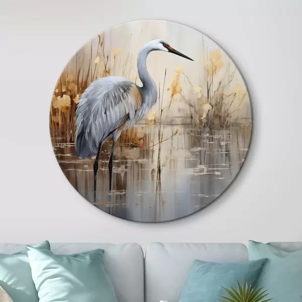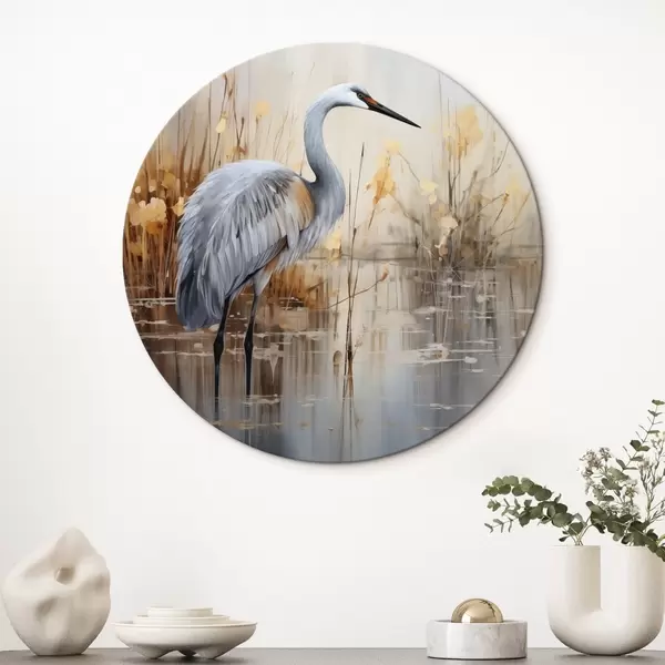 Quadri rotondi Un airone grigio in piedi in uno stagno, circondato da piante alte e sottili, lo sfondo è una morbida miscela di beige e bianco r43398
