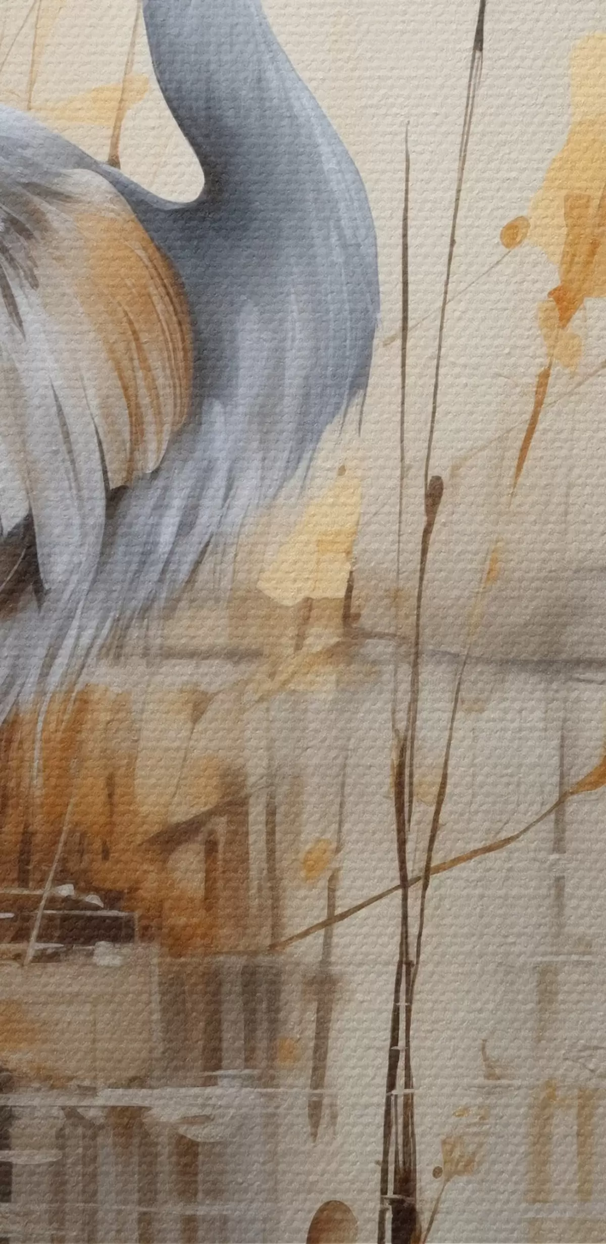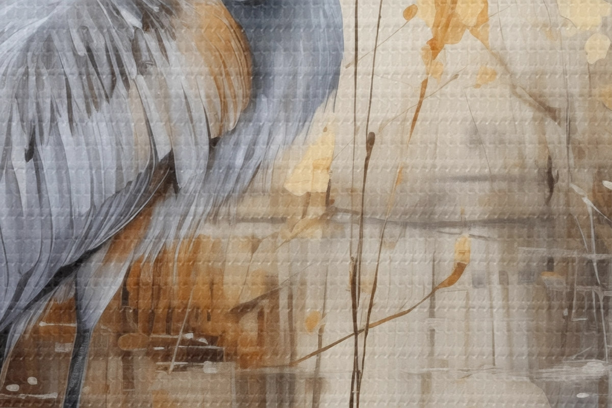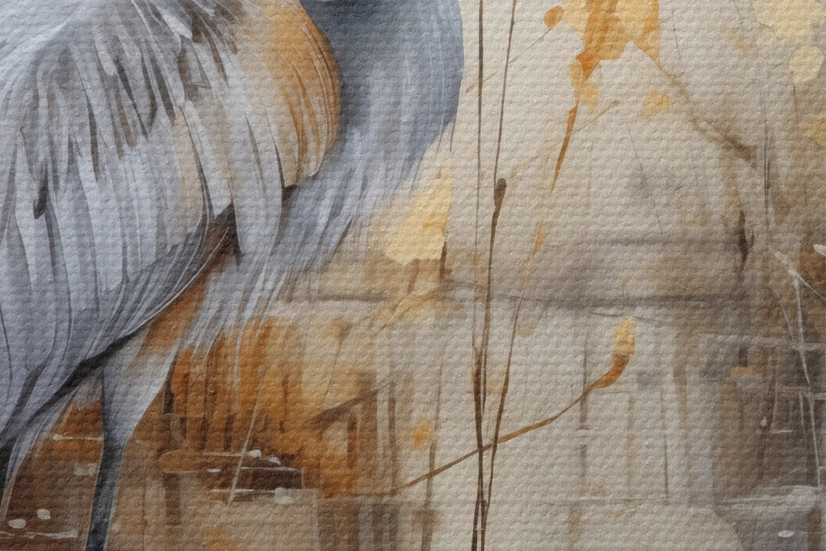 Immagine Un airone grigio in piedi in uno stagno, circondato da piante alte e sottili, lo sfondo è una morbida miscela di beige e bianco Nr r43398