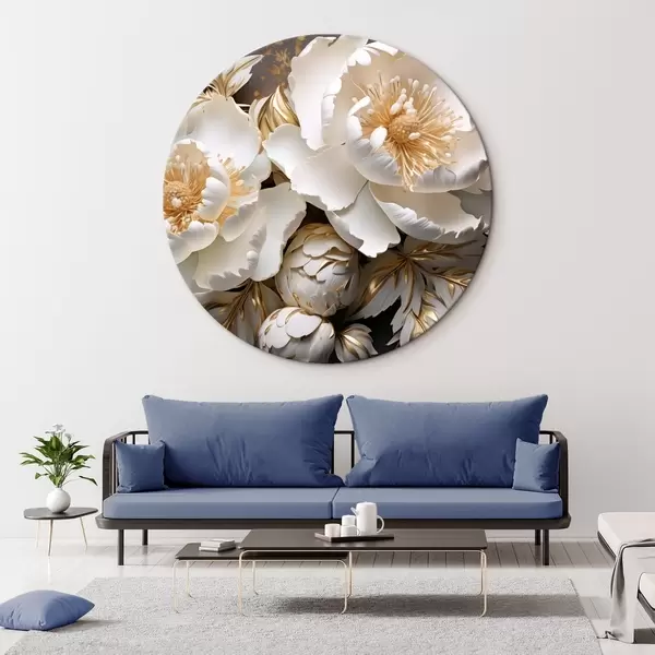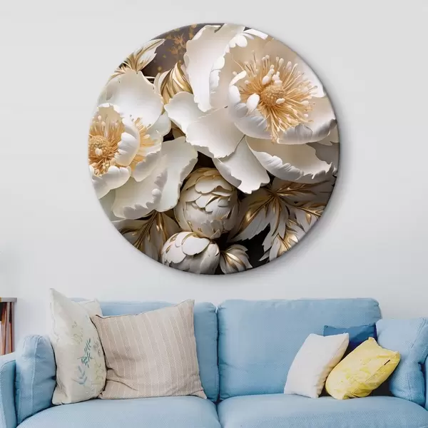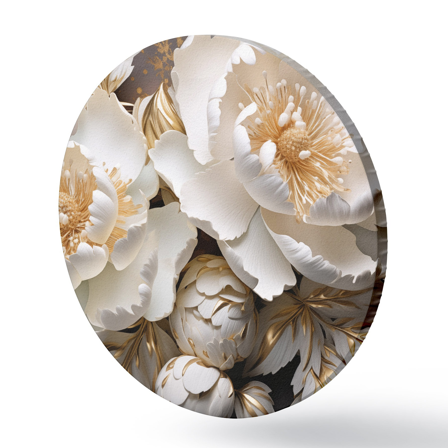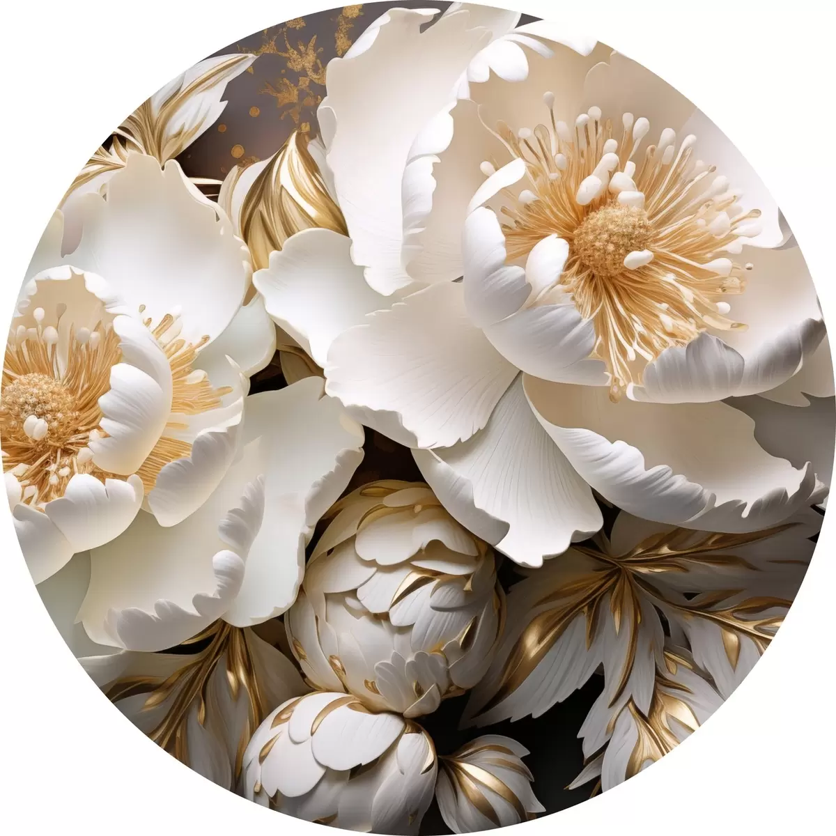 Quadri rotondi Peonie bianche e gialle con foglie, dettagli intricati, arte decorativa, sfondo scuro r43399