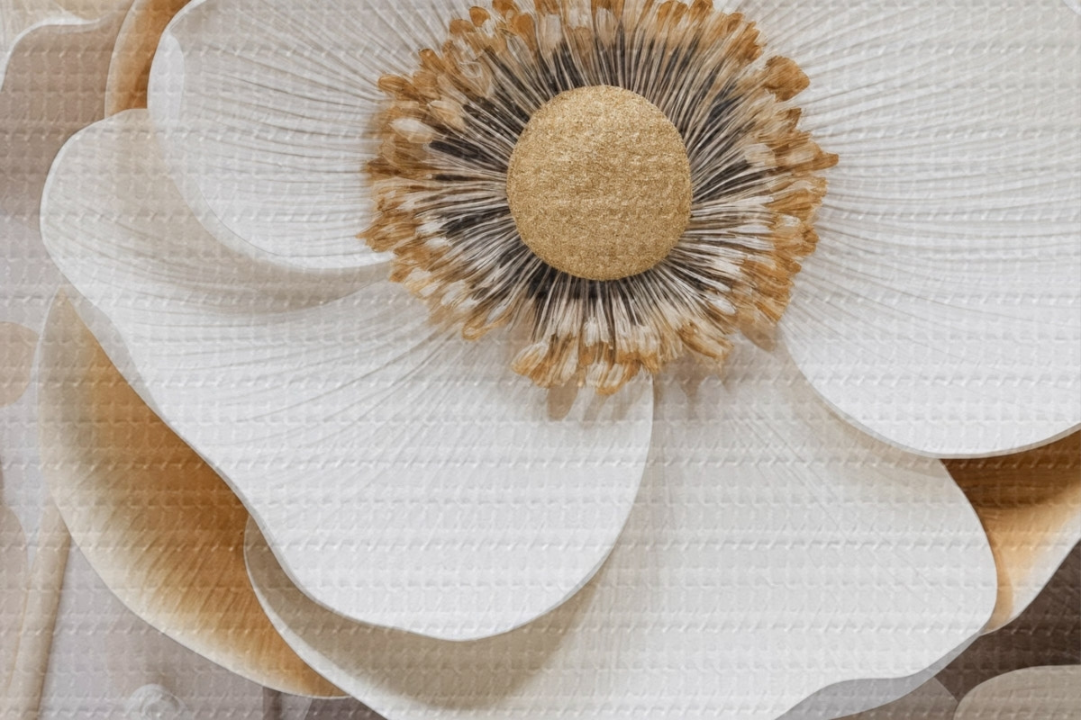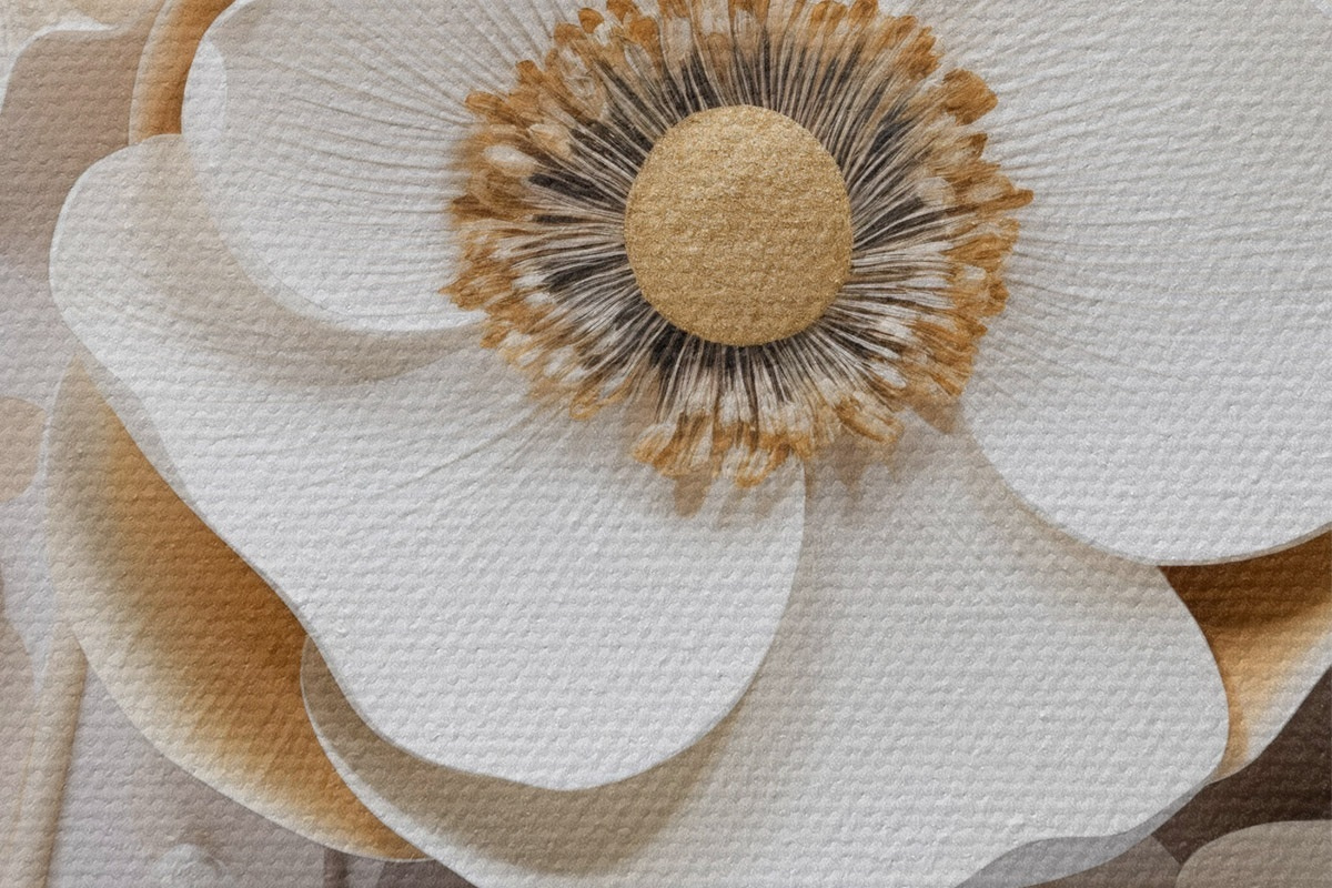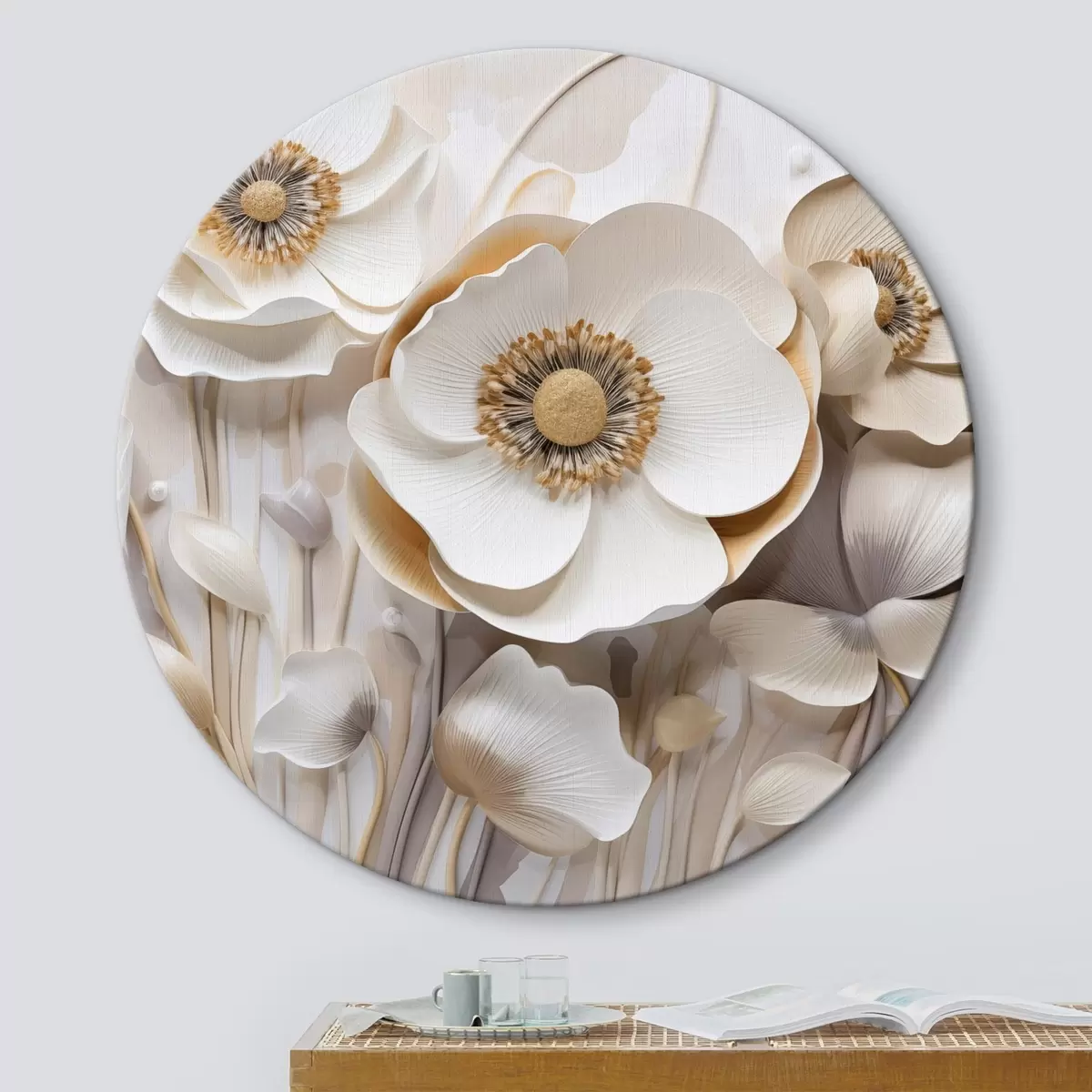 Quadri rotondi Fiori di anemone bianchi con centri gialli, con sfondo minimalista, che creano un delicato disegno floreale r43400