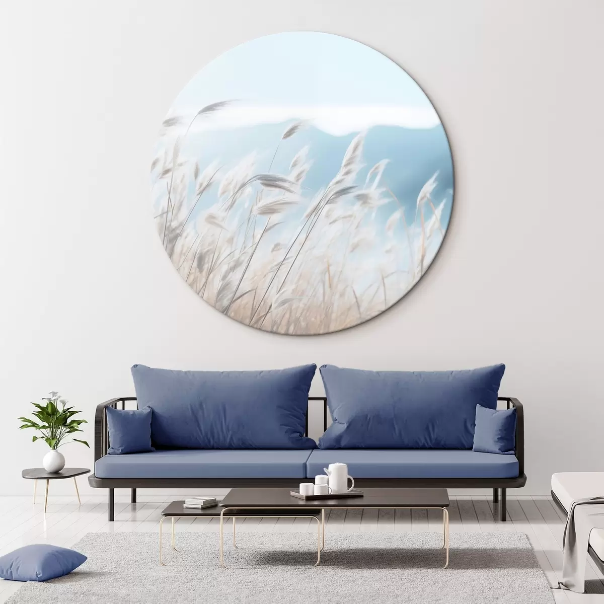 Quadri rotondi Erba, campo di pampa con una montagna blu sullo sfondo, cielo azzurro, minimalista, colori pastello r43404