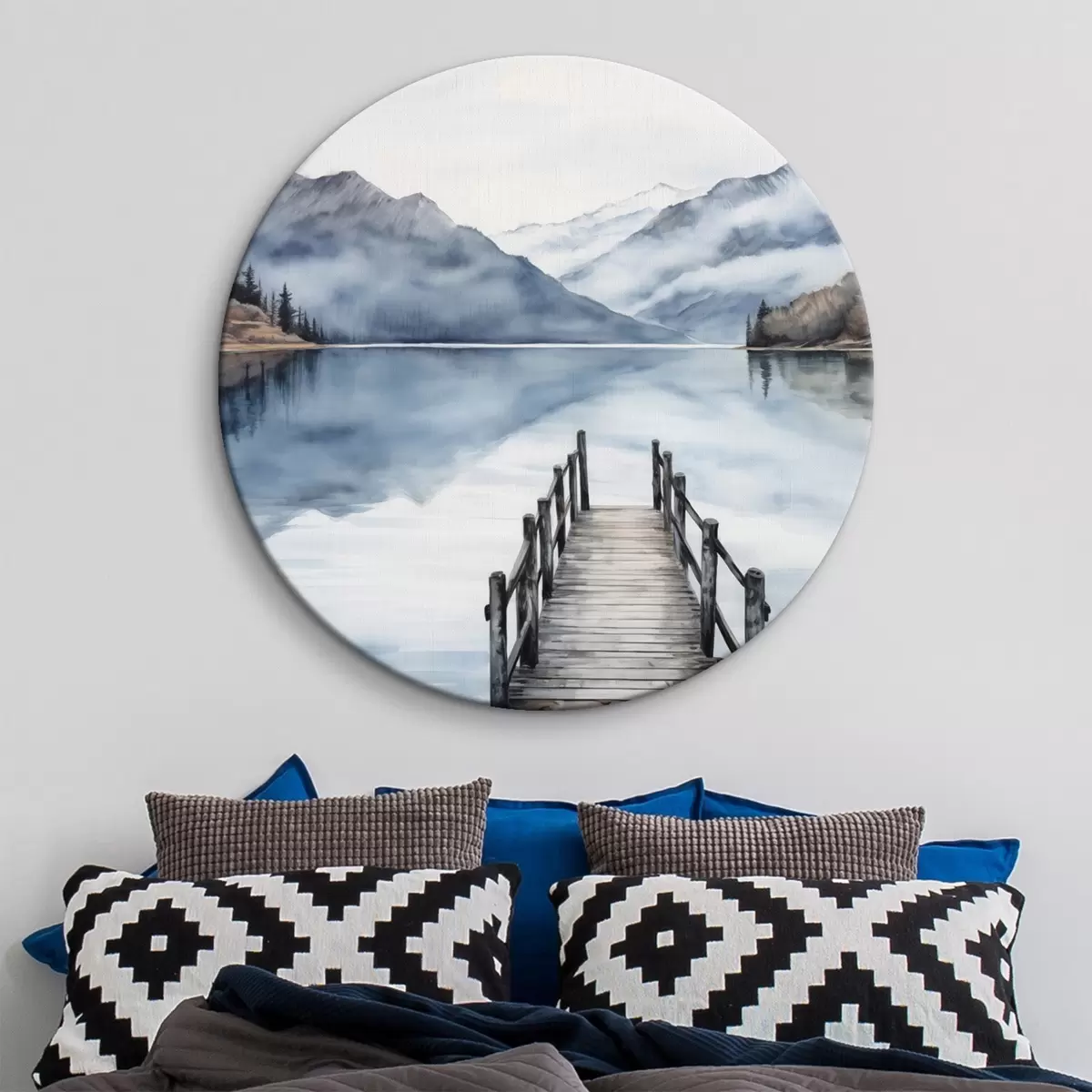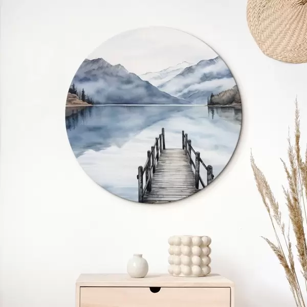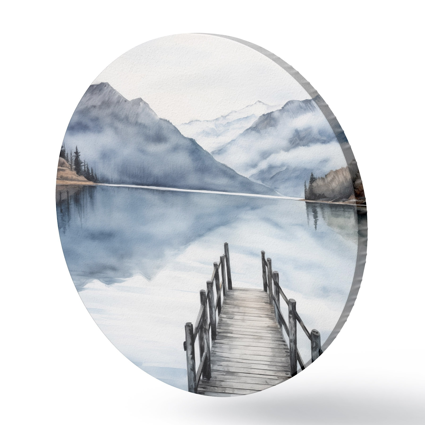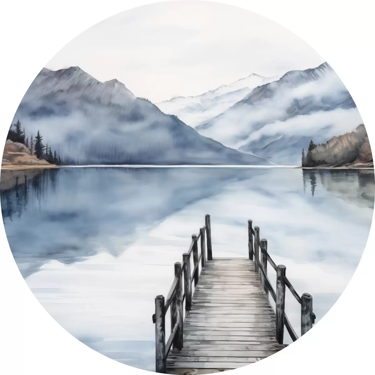 Quadri rotondi Un pontile di legno si protende in un lago tranquillo, circondato da montagne e alberi sempreverdi, stile acquerello r43405
