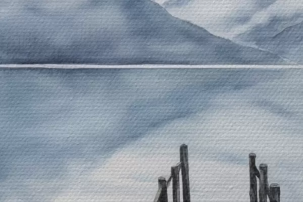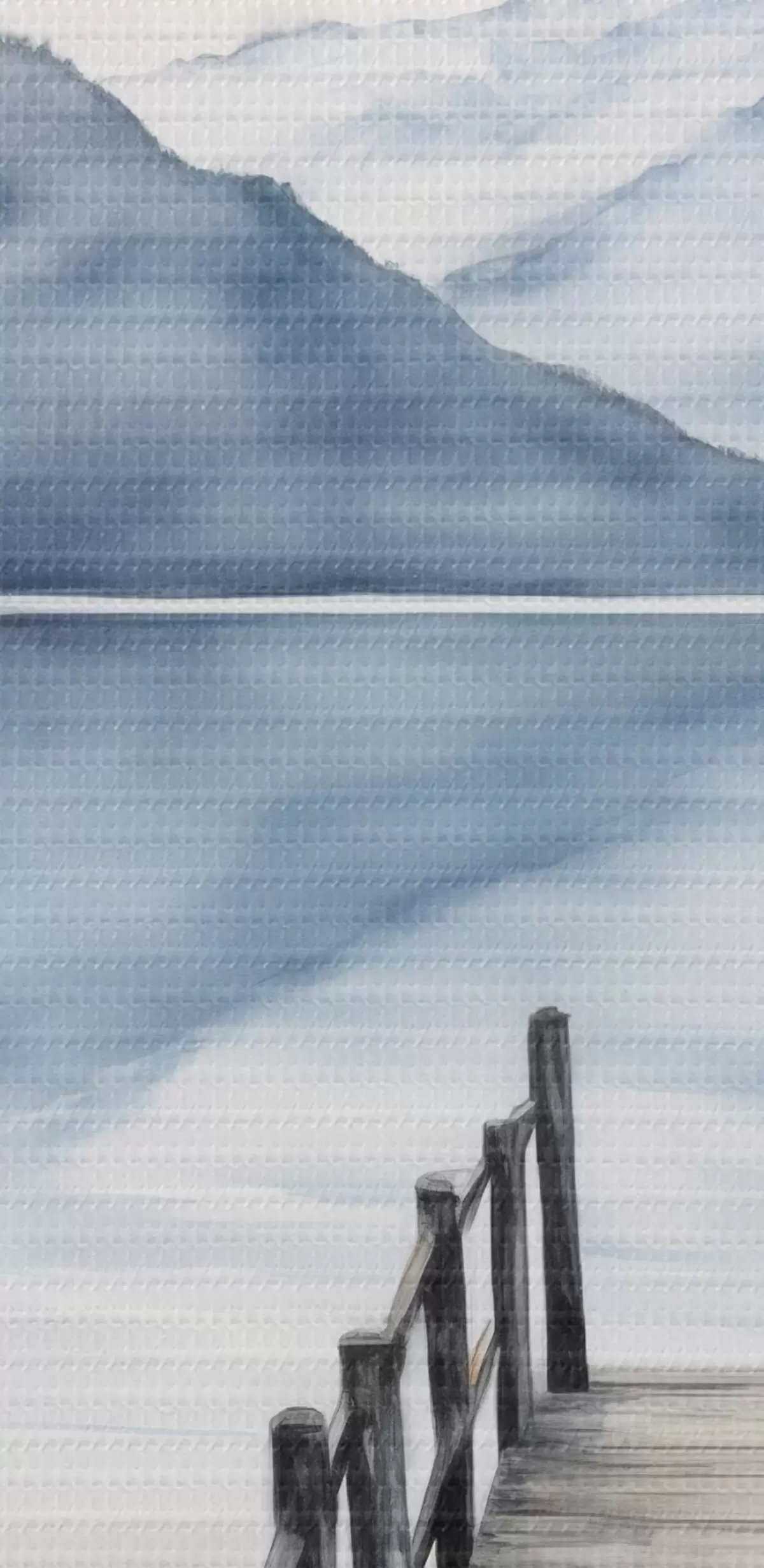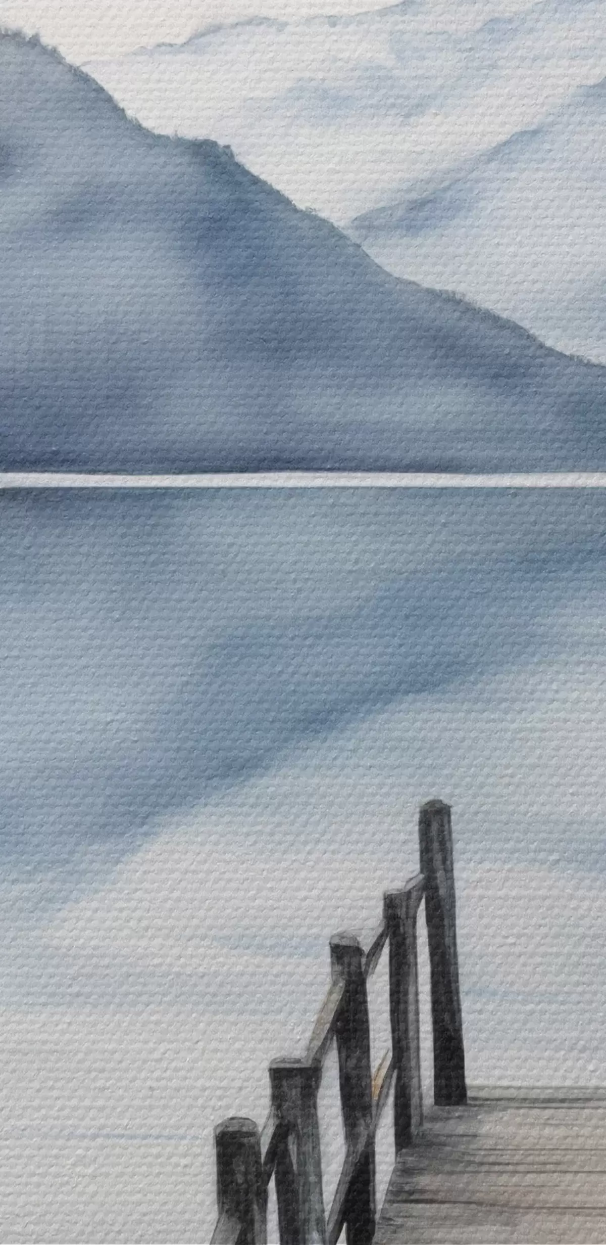 Immagine Un pontile di legno si protende in un lago tranquillo, circondato da montagne e alberi sempreverdi, stile acquerello Nr r43405