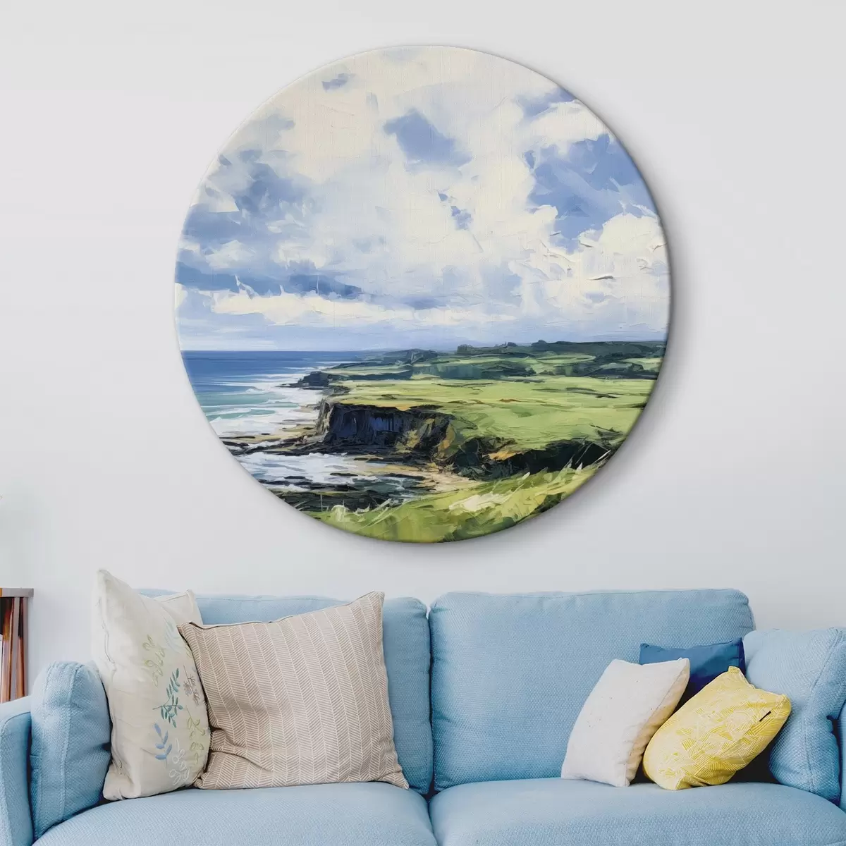 Quadri rotondi Campo verde con una scogliera sulla costa, mare blu con le onde, cielo nuvoloso, minimalista moderna pittura ad olio imitazione r43406