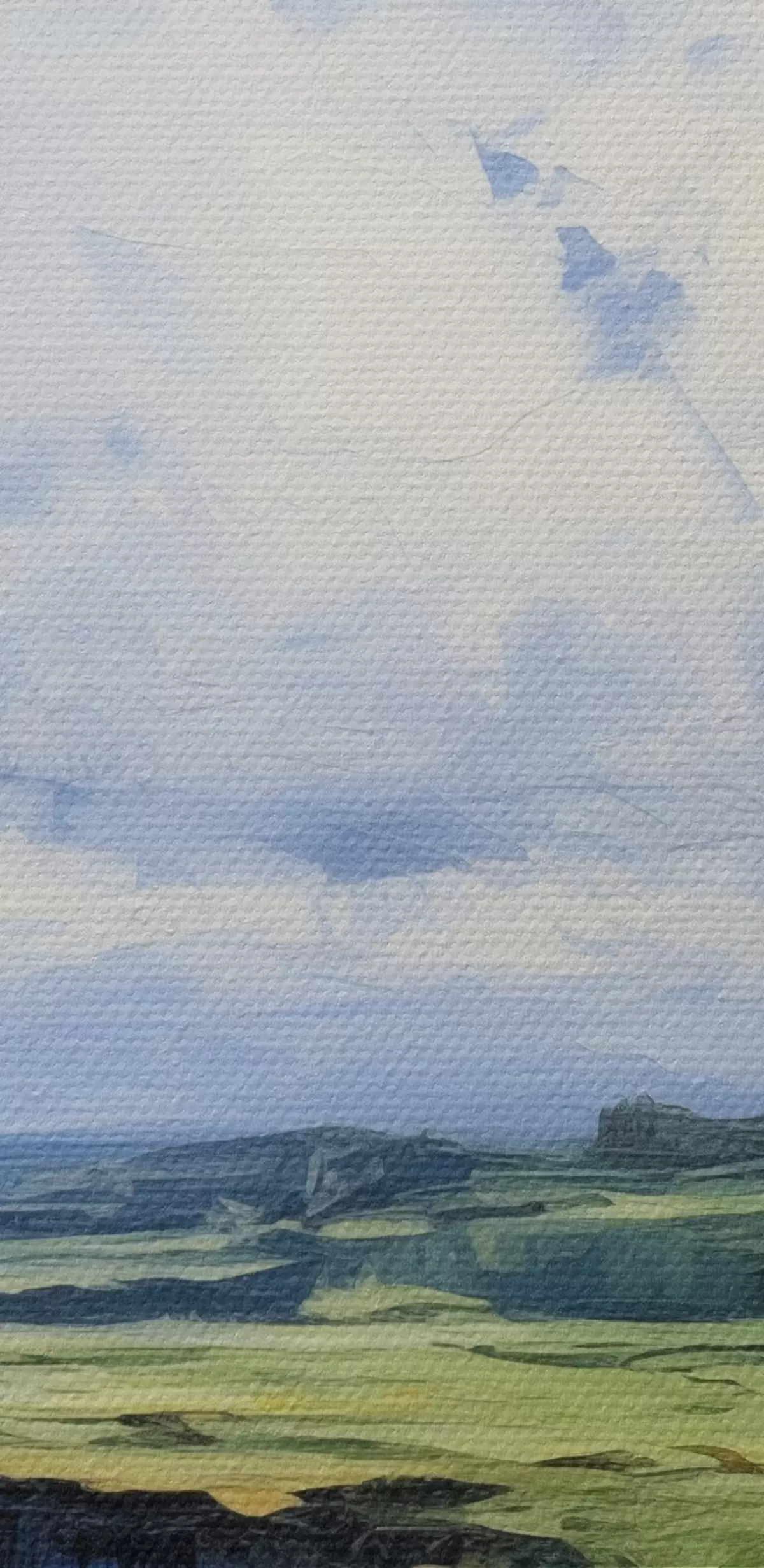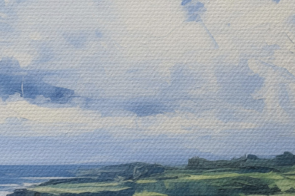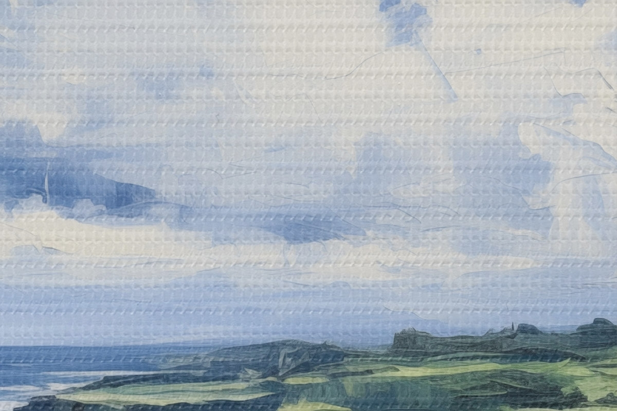 Immagine Campo verde con una scogliera sulla costa, mare blu con le onde, cielo nuvoloso, minimalista moderna pittura ad olio imitazione Nr r43406