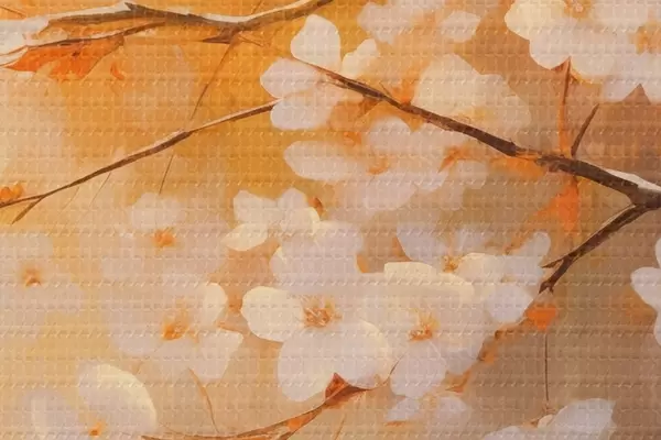 Immagine Rami di ciliegio in fiore con fiori arancioni, tavolozza di colori caldi, su uno sfondo sfocato di tonalità gialle Nr r43407