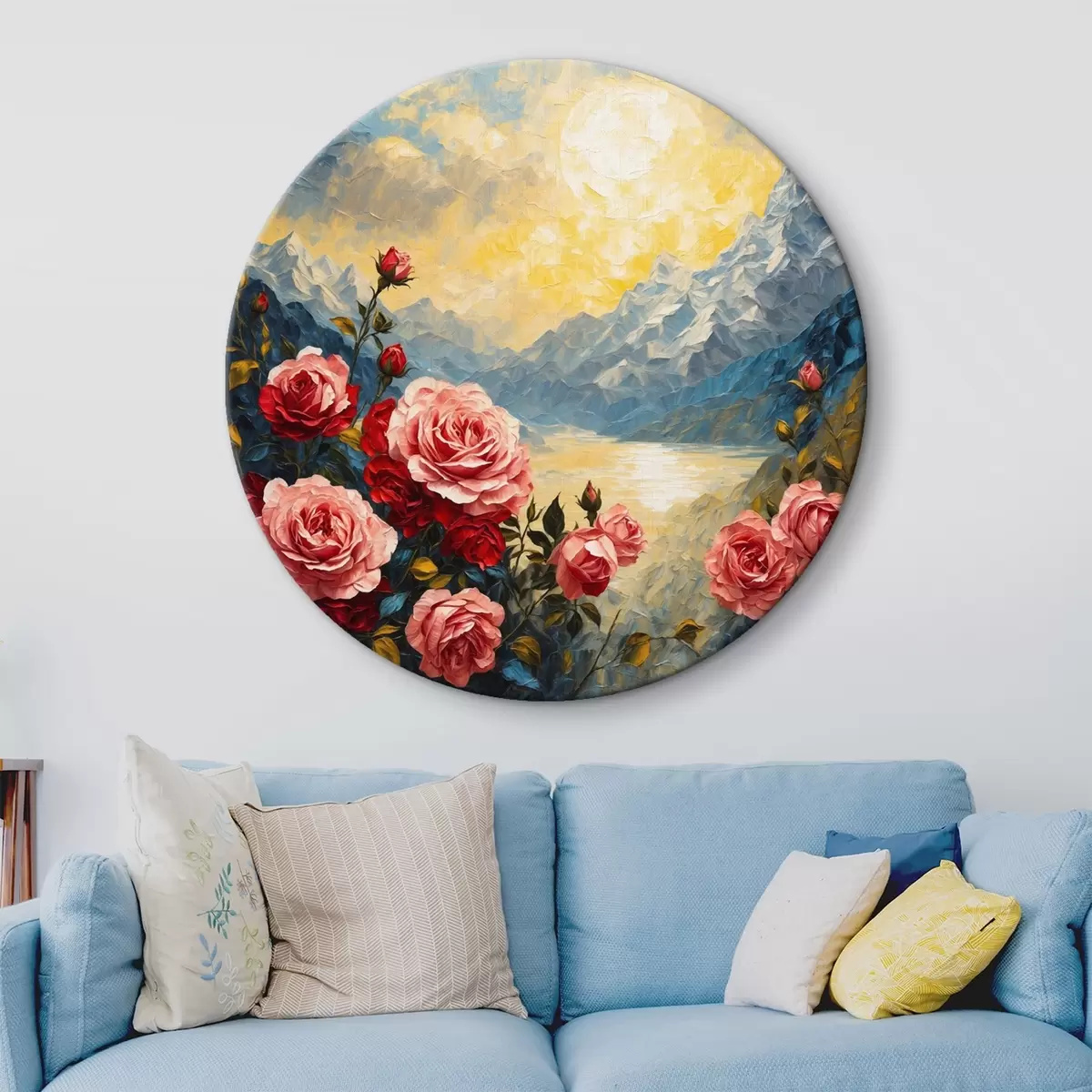 Quadri rotondi Rose su sfondo di montagna in stile pittura ad olio r43457