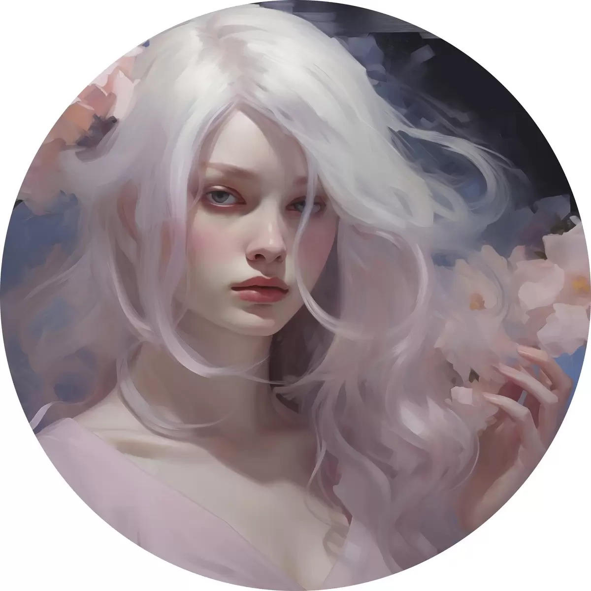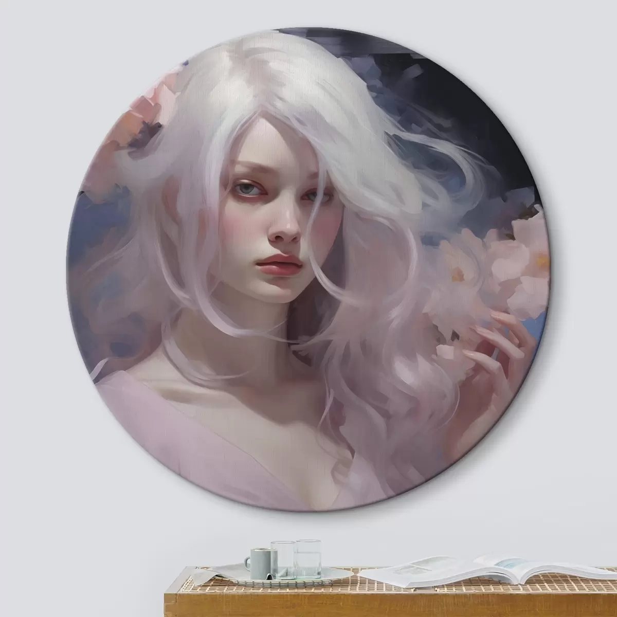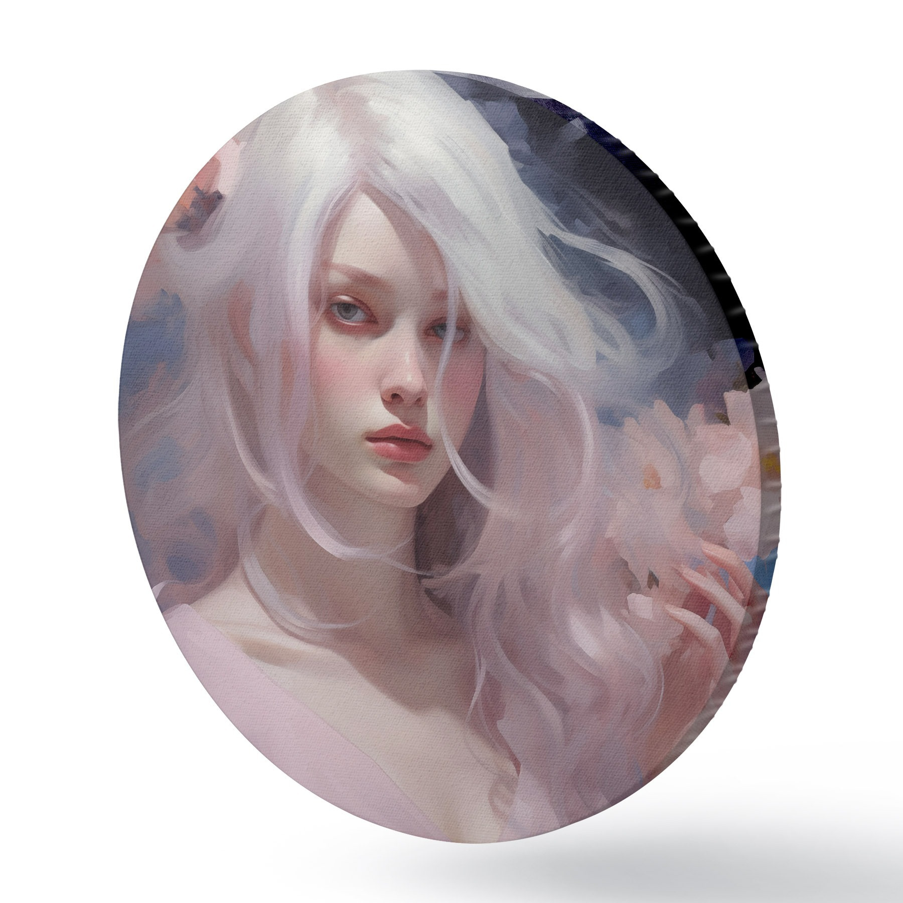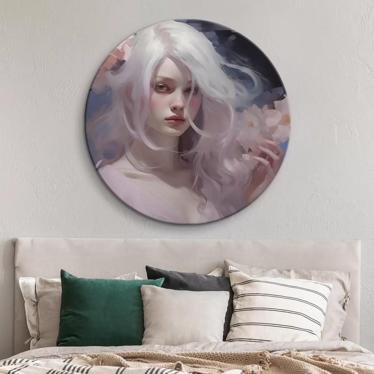 Quadri rotondi Ragazza con peonie, disegno in stile acrilico, sfondo scuro r43496
