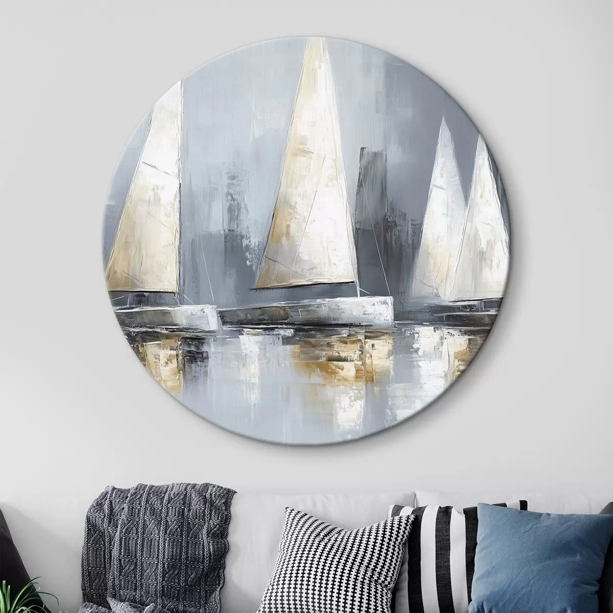 Quadri rotondi Barche a vela con riflessi nell'acqua, disegno ad olio, colori grigi r43506
