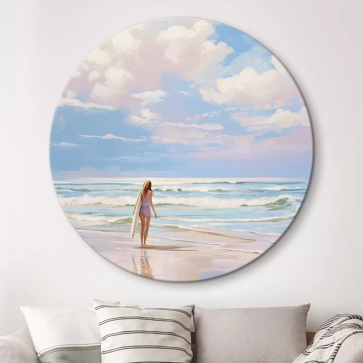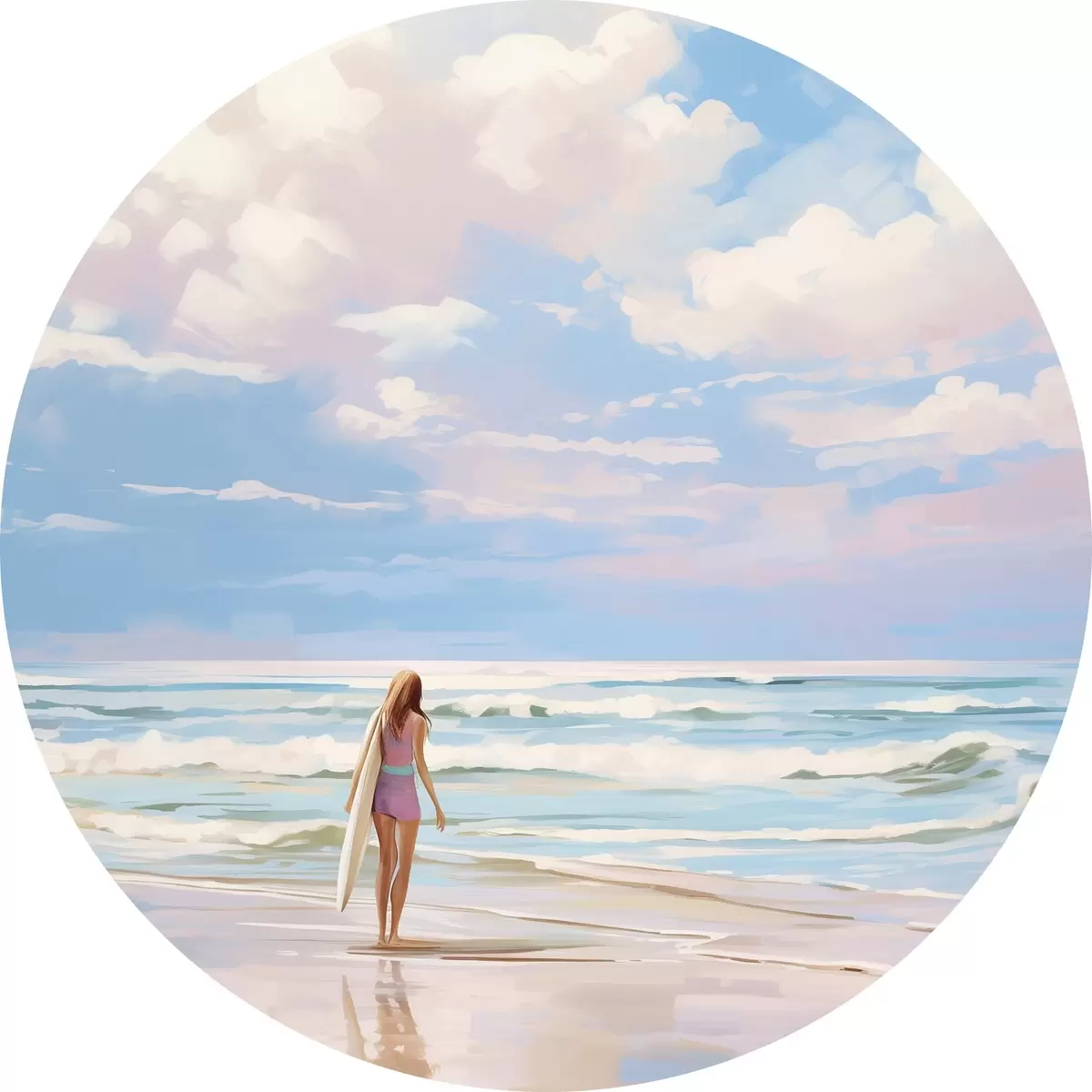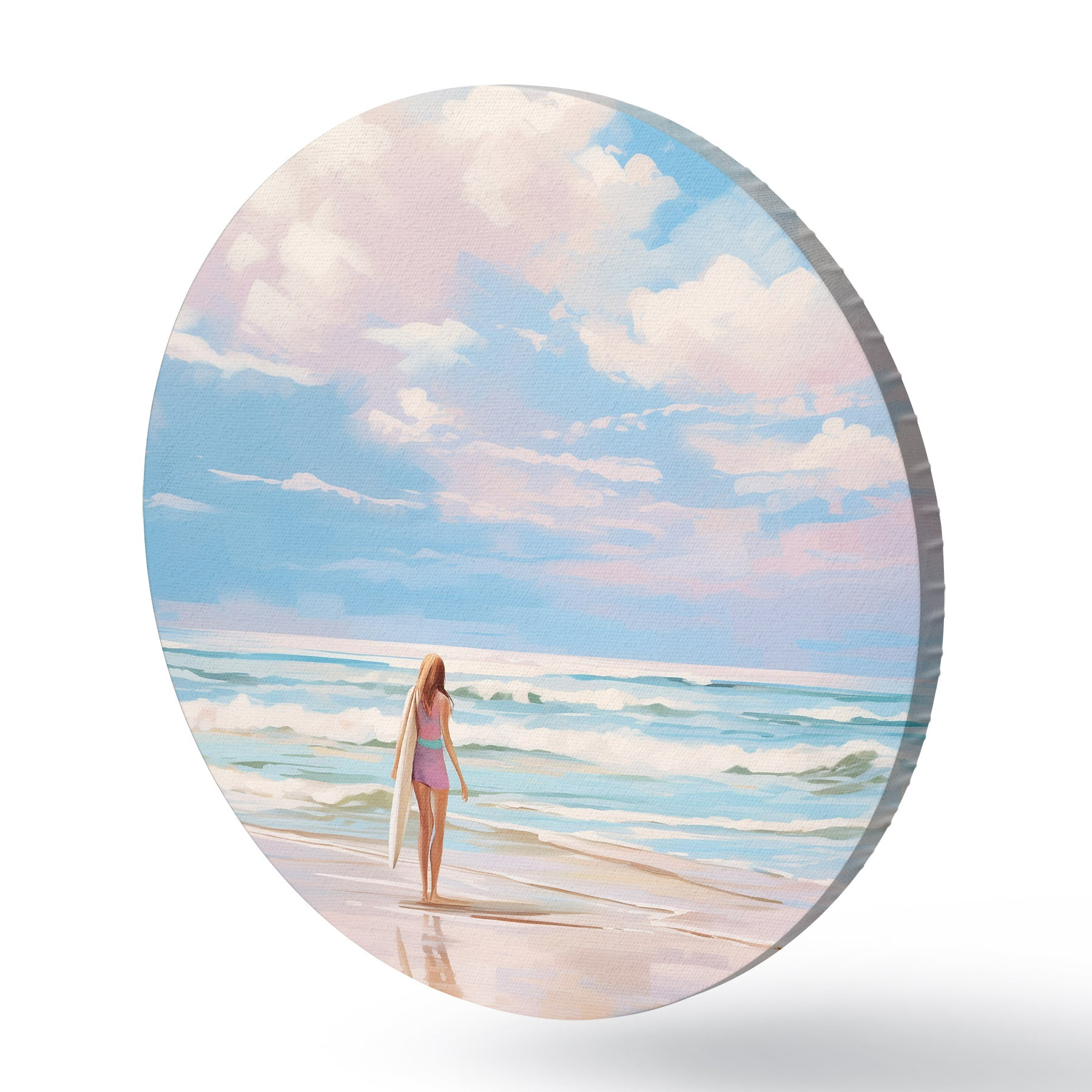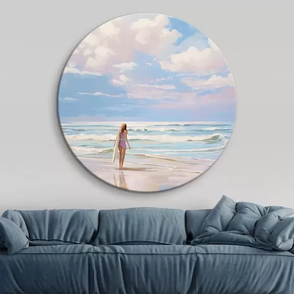 Quadri rotondi Ragazza che fa surf nell'oceano, estate, onde, stile acrilico r43882