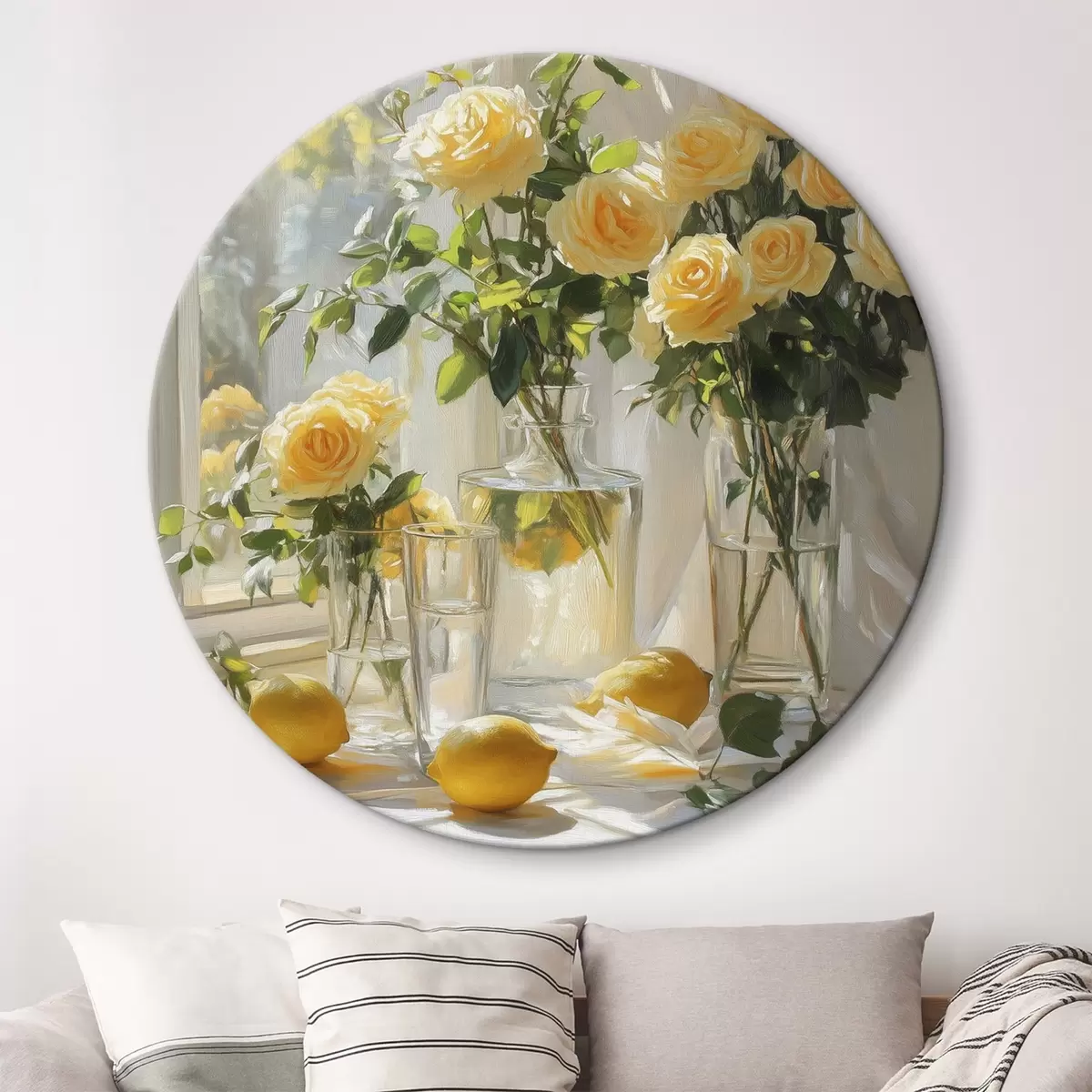 Quadri rotondi Rose in vaso, disegno a olio, luce delicata del sole, limoni, primavera r43887