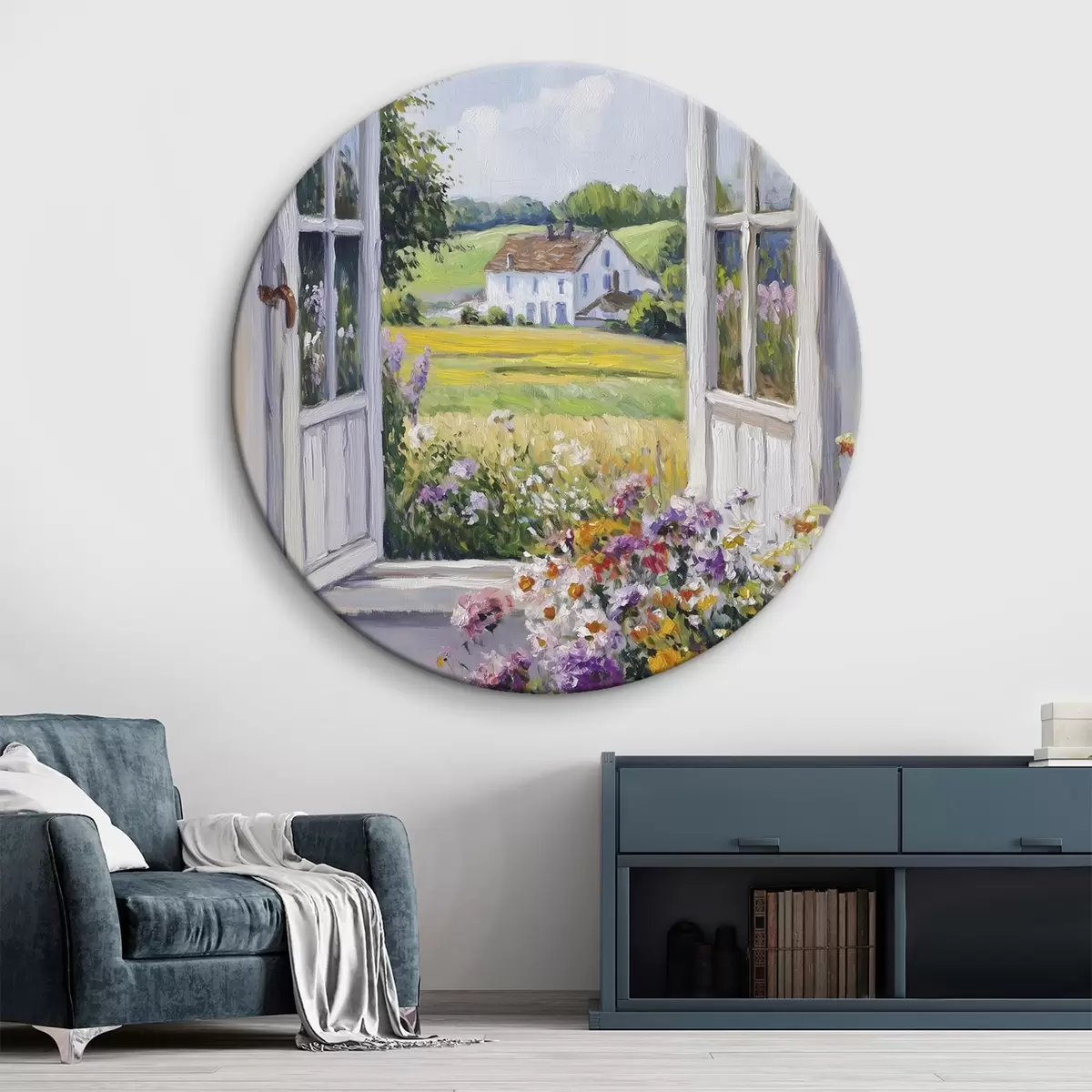 Quadri rotondi Paesaggi di paese nella finestra di legno, fiori, campi, stile olio, casa colonica r43888