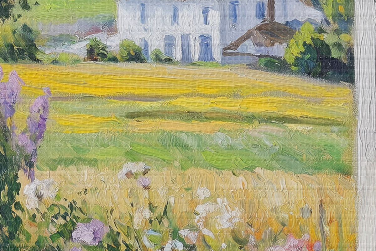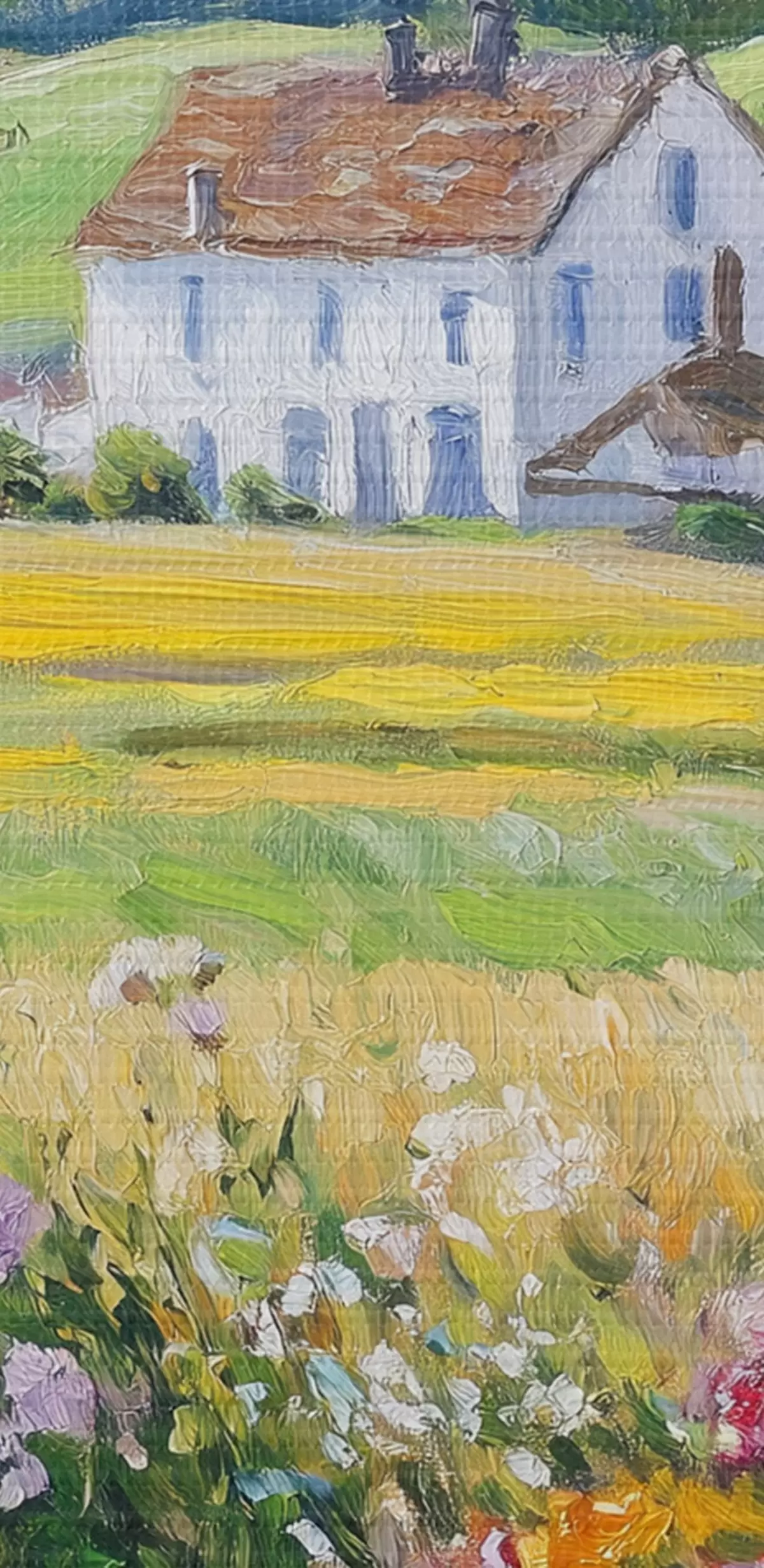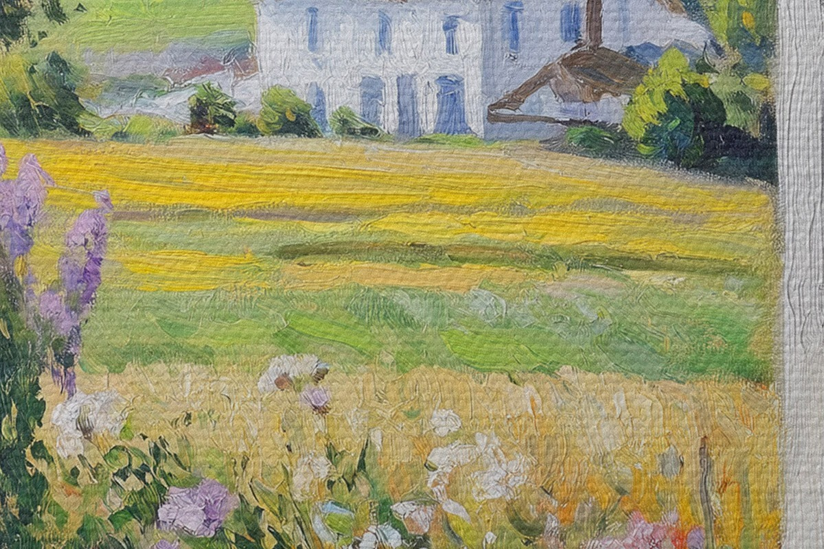 Immagine Paesaggi di paese nella finestra di legno, fiori, campi, stile olio, casa colonica Nr r43888