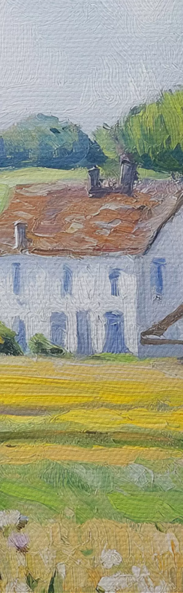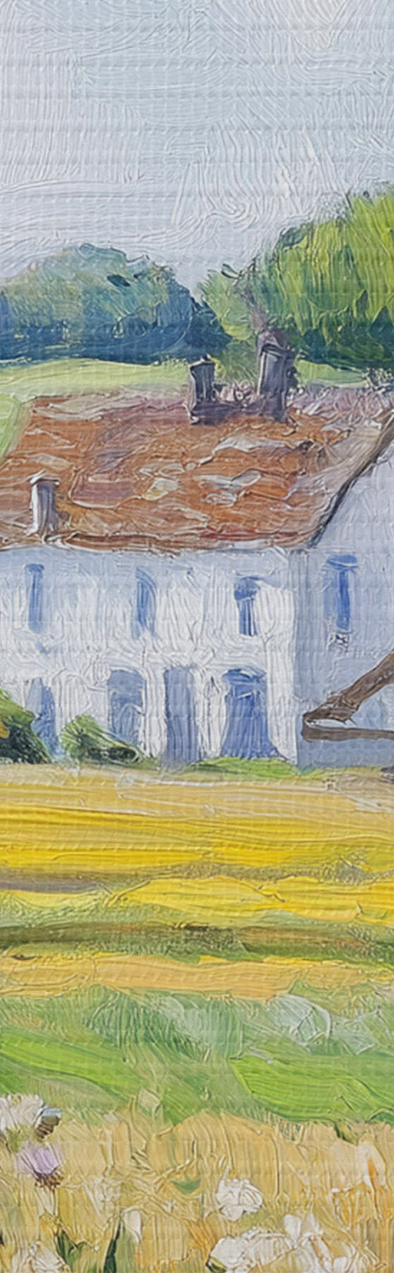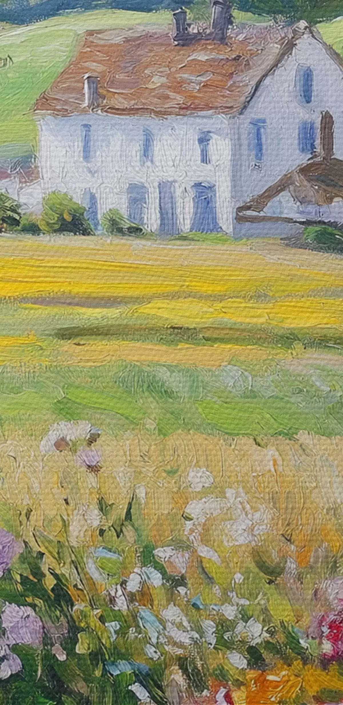 Immagine Paesaggi di paese nella finestra di legno, fiori, campi, stile olio, casa colonica Nr r43888