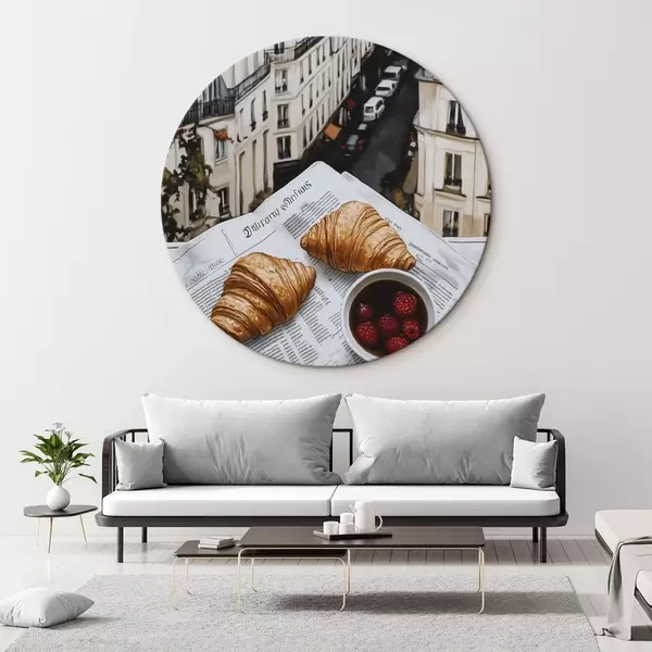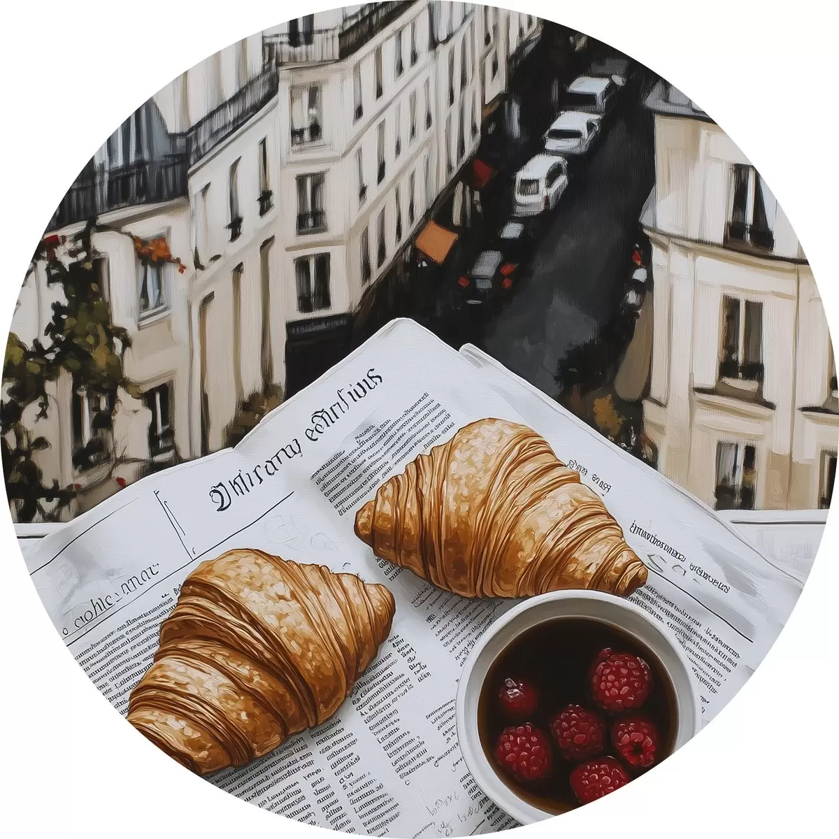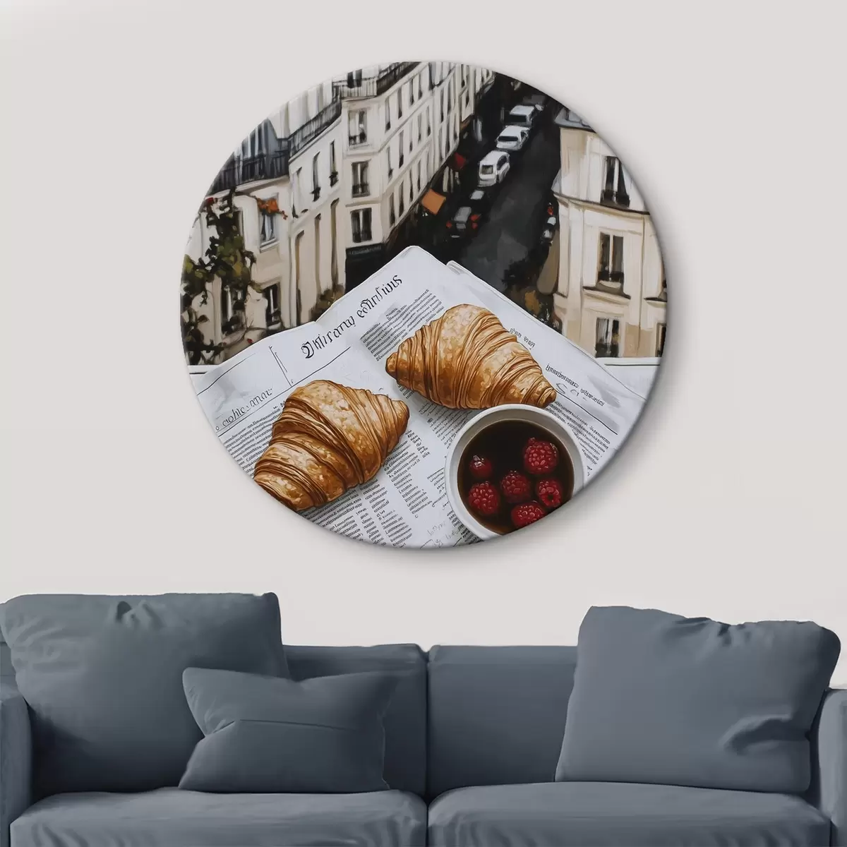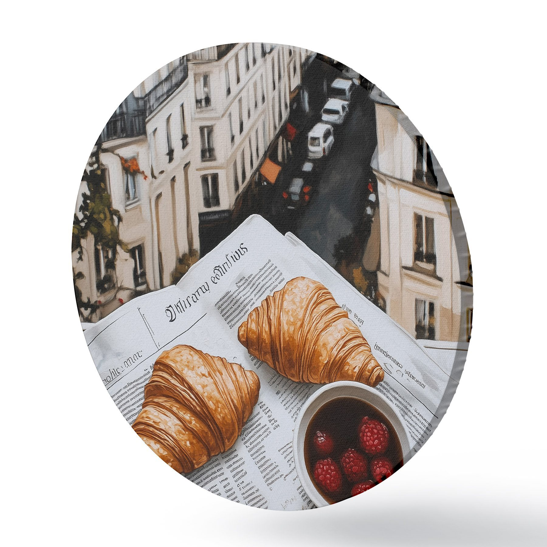 Quadri rotondi Caffè mattutino con croissant, strada della città, stile architettonico, olio r43891