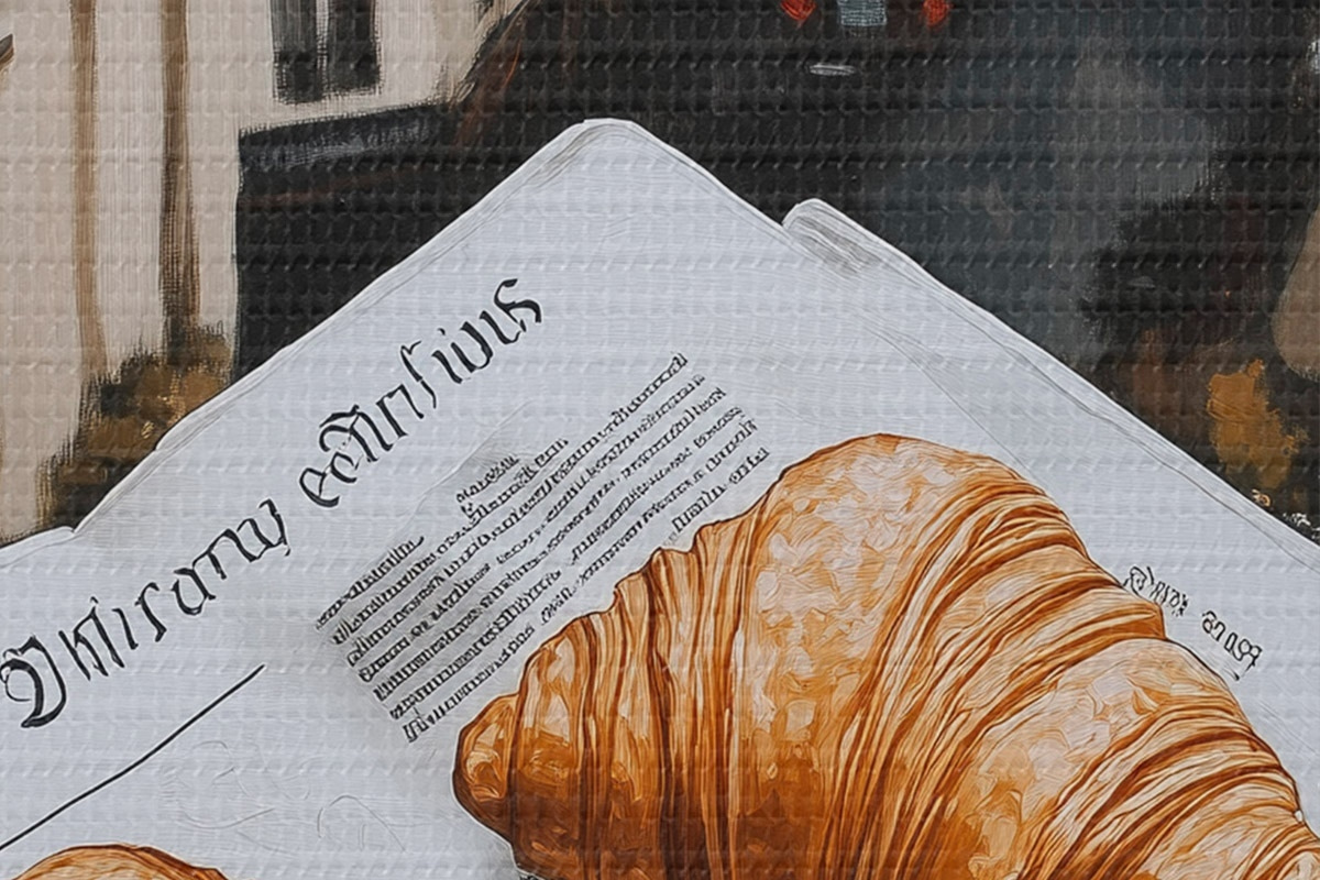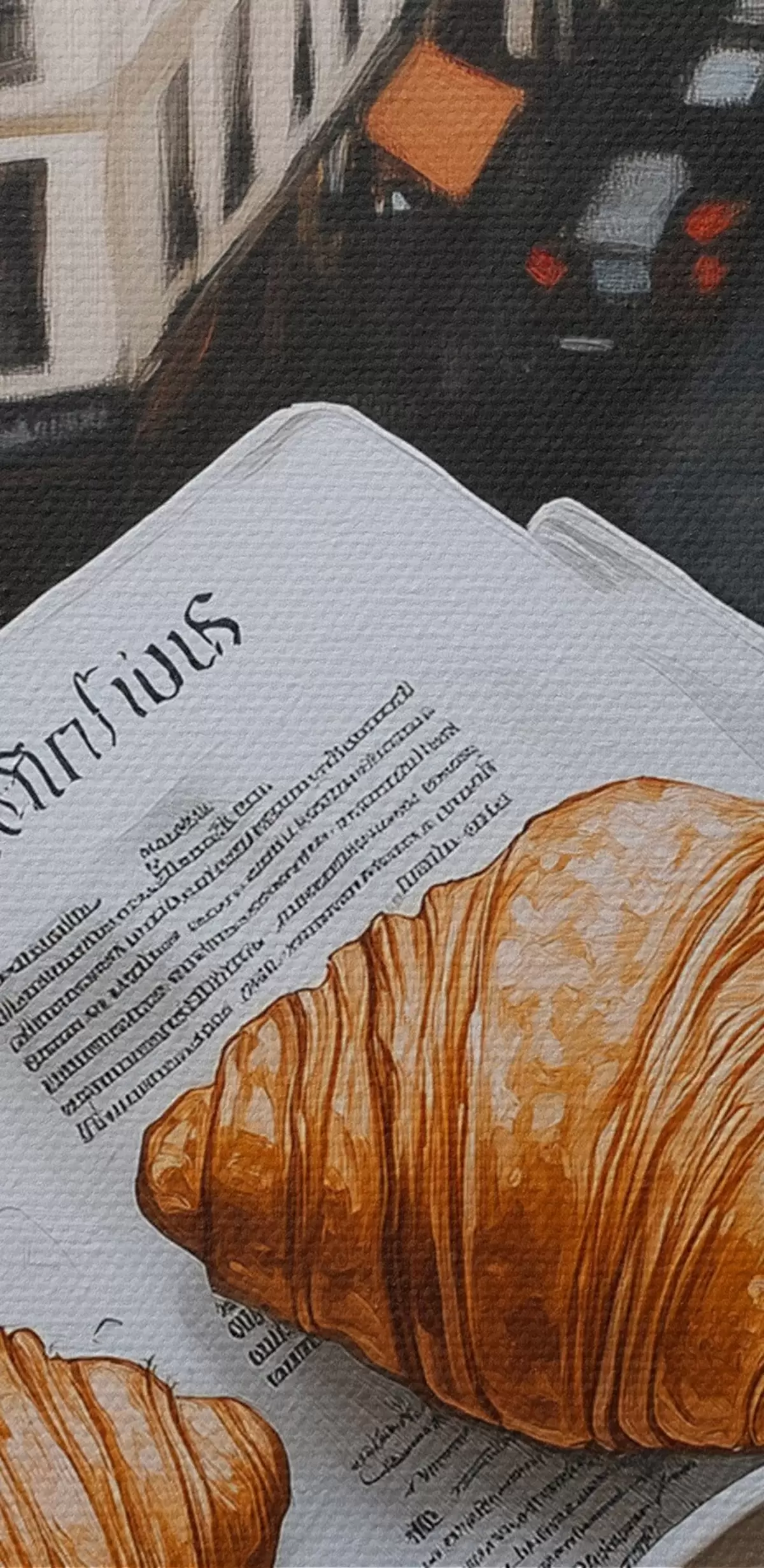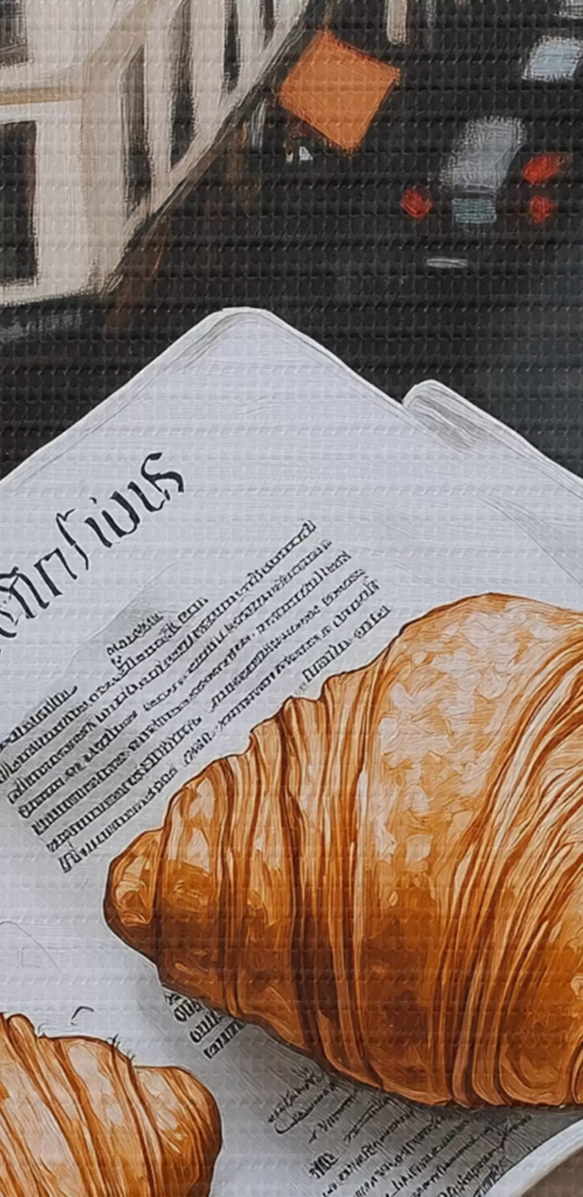 Immagine Caffè mattutino con croissant, strada della città, stile architettonico, olio Nr r43891
