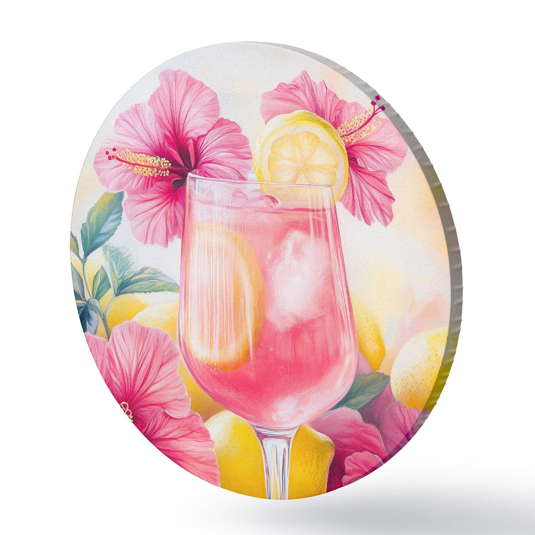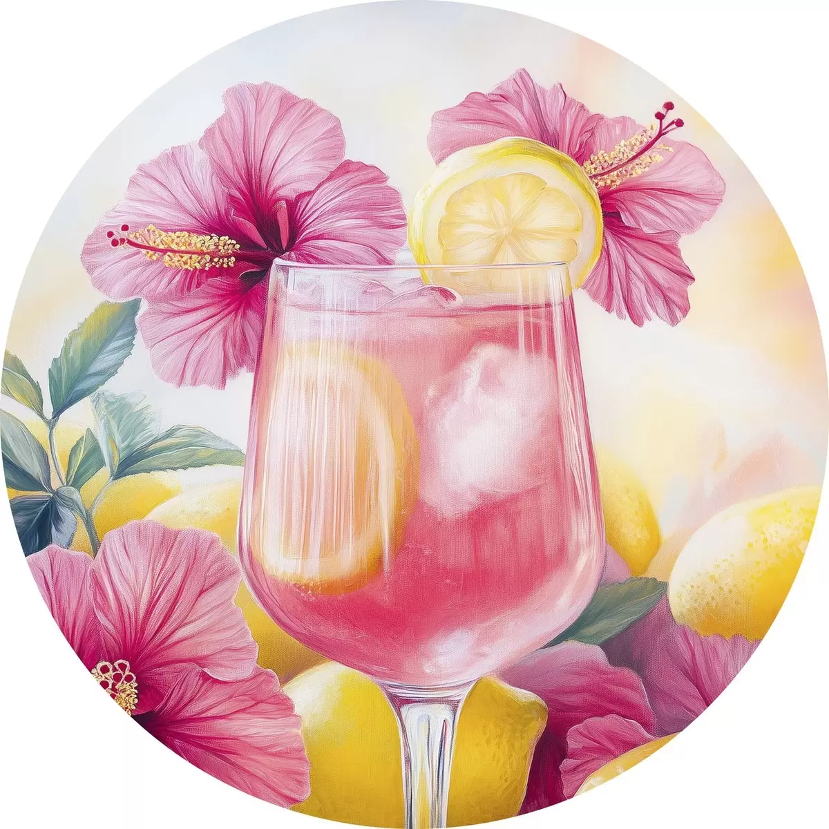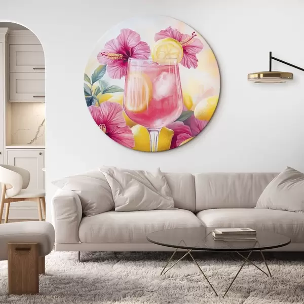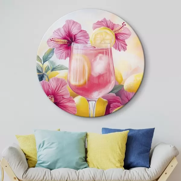 Quadri rotondi Cocktail colorato con fiori di ibisco e limoni, estate, stile acquerello r43894