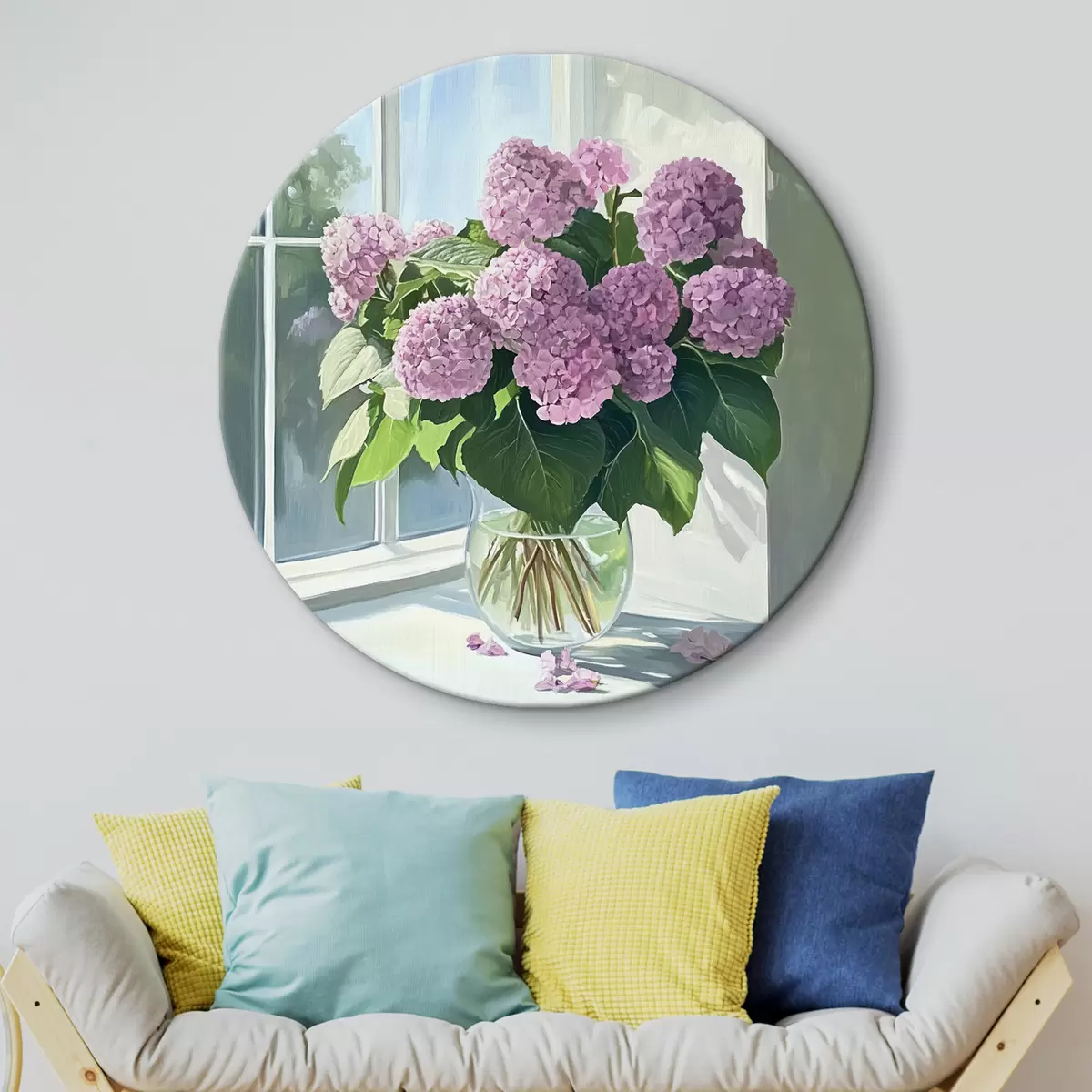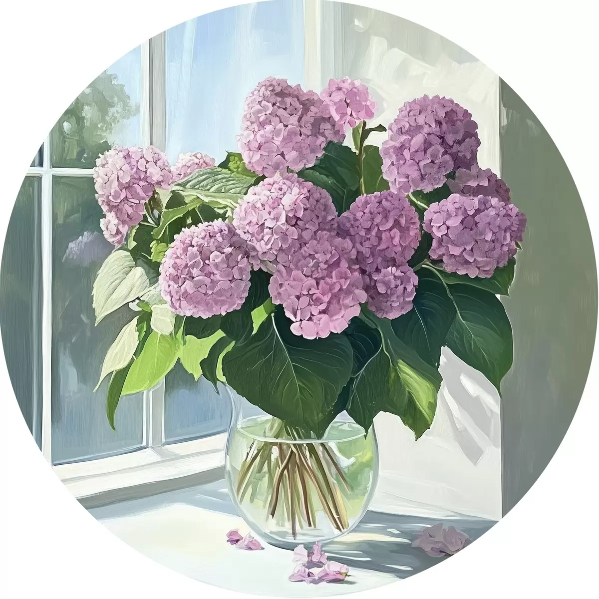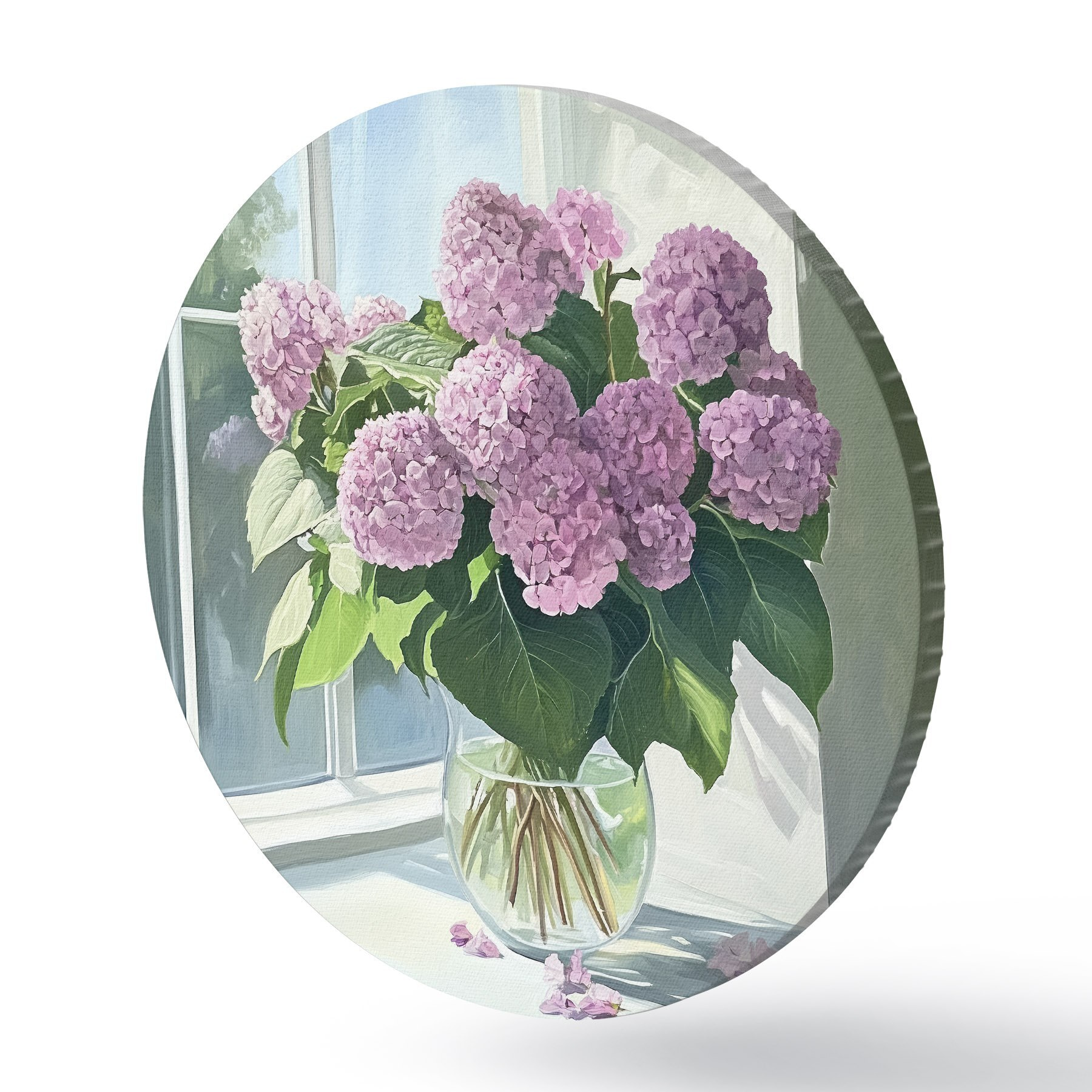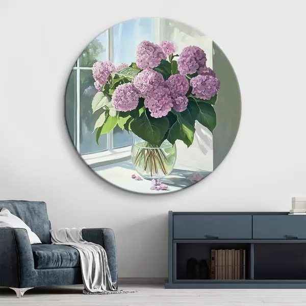Quadri rotondi Bouquet di fiori viola sulla finestra r43906