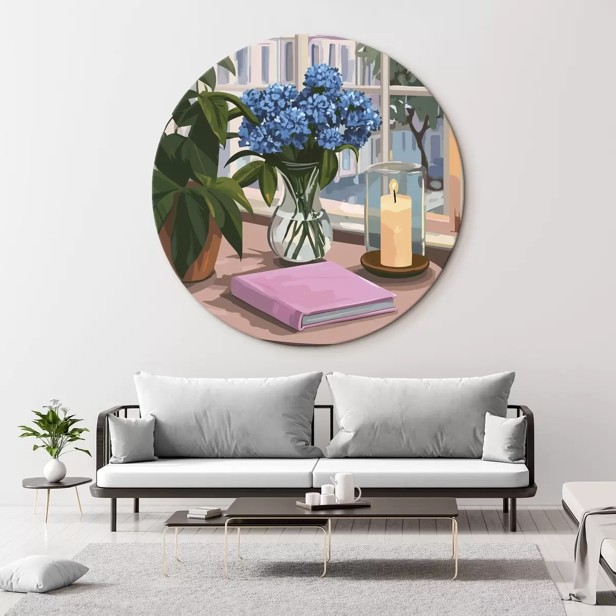 Quadri rotondi Ortensie nel vaso, vista dalla finestra, candela, casa accogliente r44009