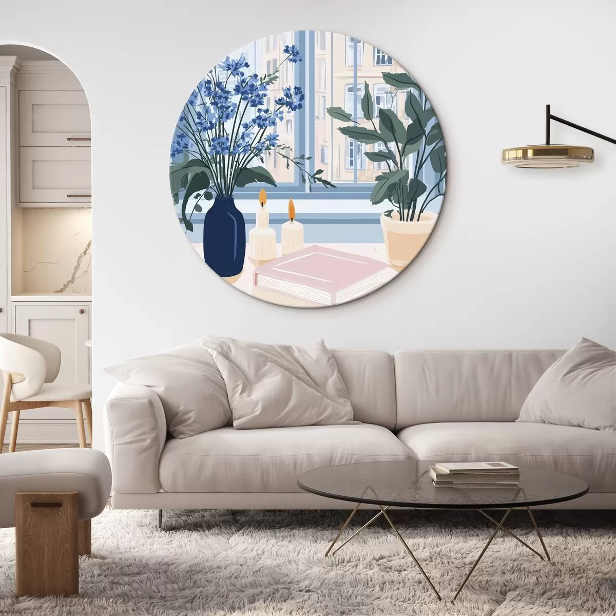 Quadri rotondi Casa accogliente con fiori e vista sulla finestra, architettura, colori blu r44010