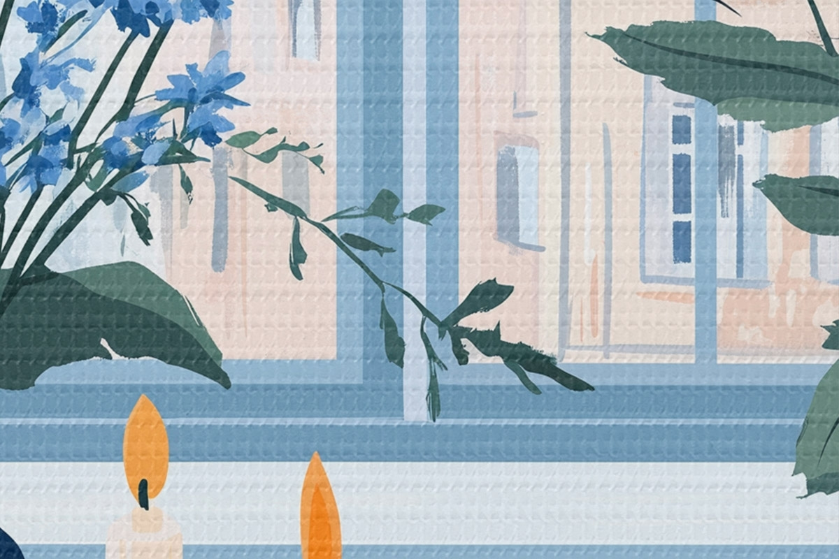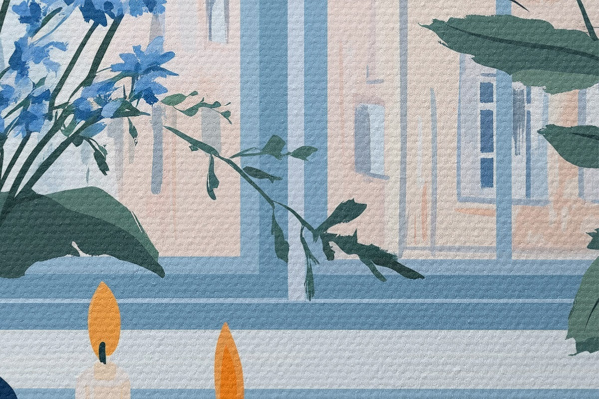 Immagine Casa accogliente con fiori e vista sulla finestra, architettura, colori blu Nr r44010