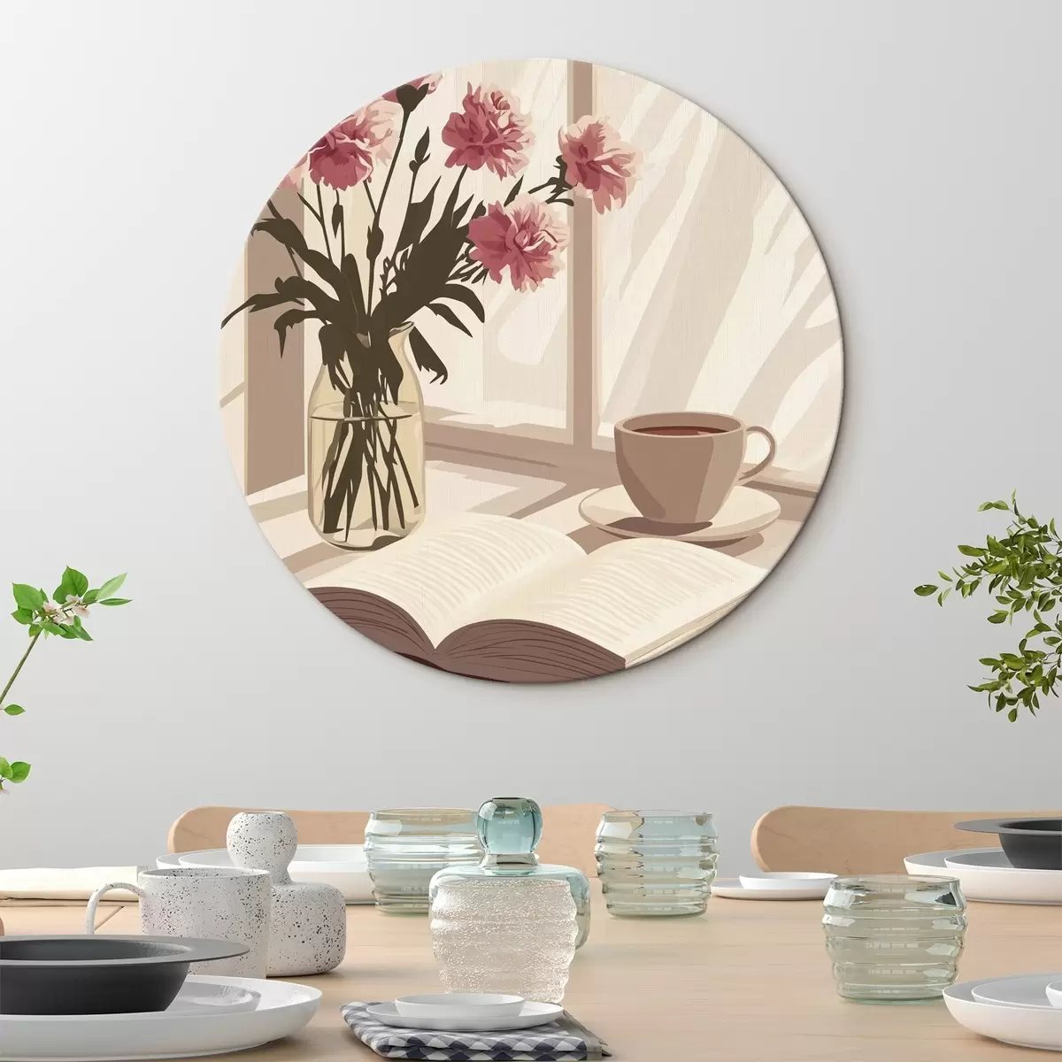 Quadri rotondi Estetica mattutina, tazza di caffè, libro, fiori di garofano r44012