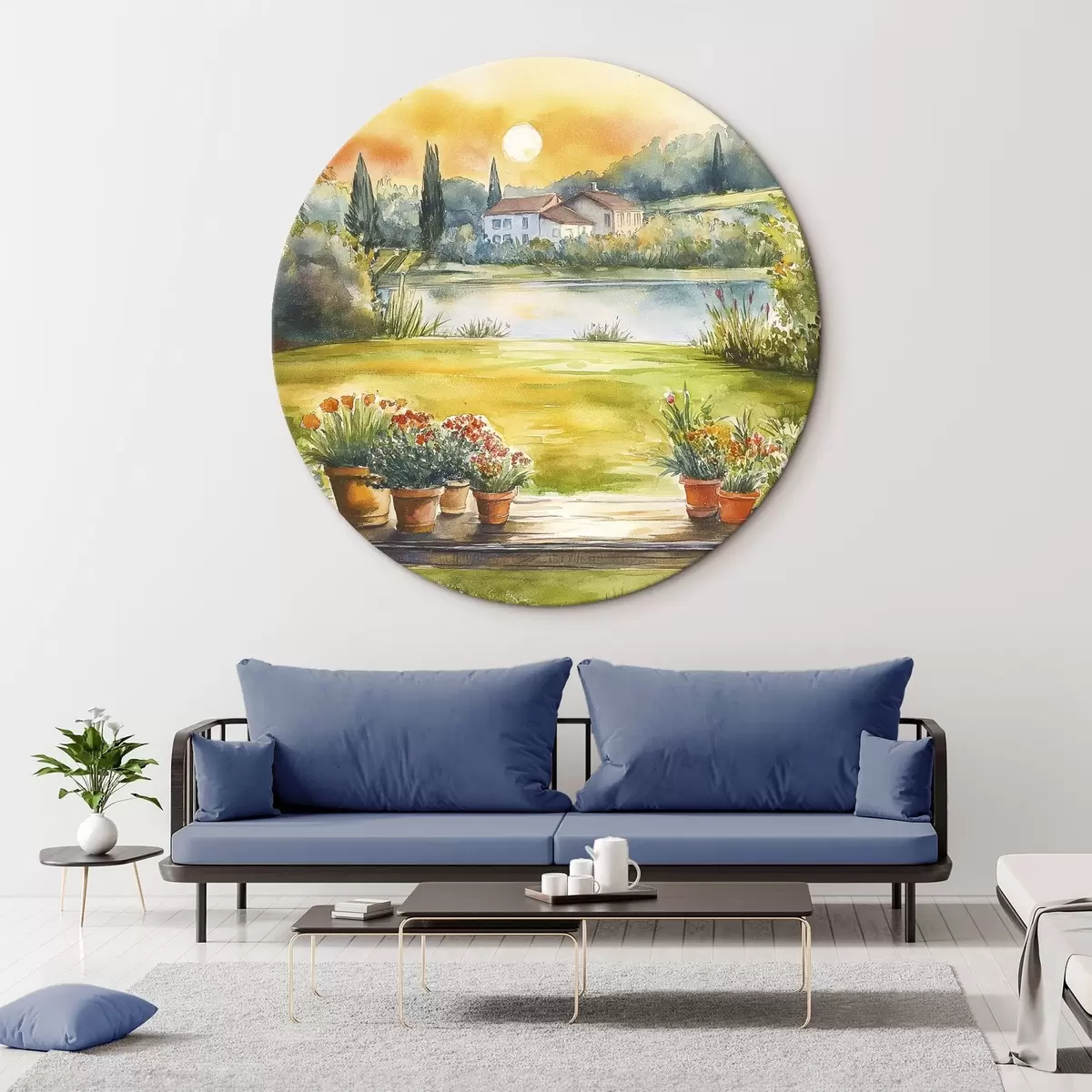 Quadri rotondi Villaggio al tramonto, rustico, fiori estivi, lago, stile acquerello r44016