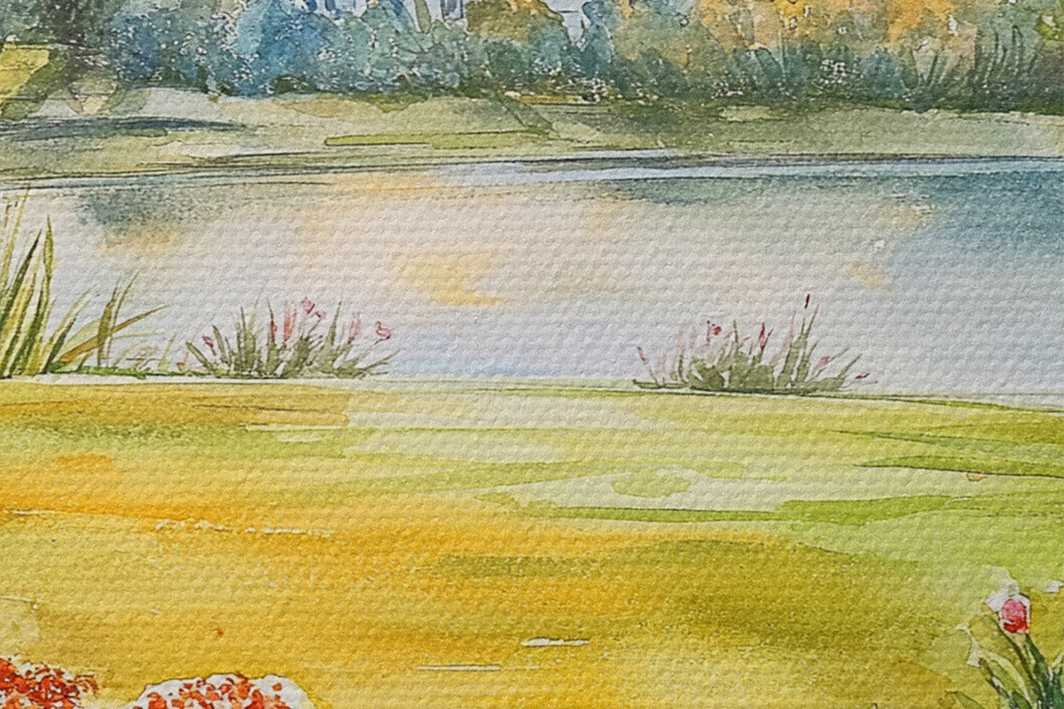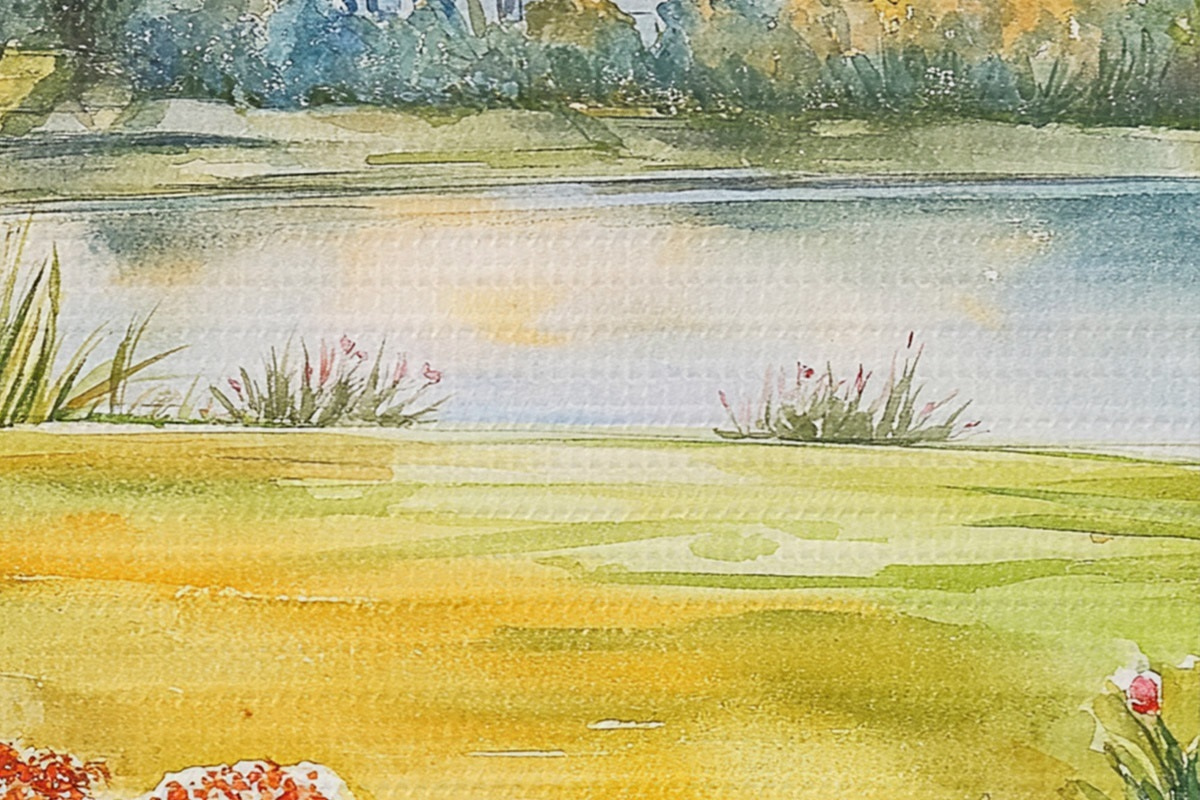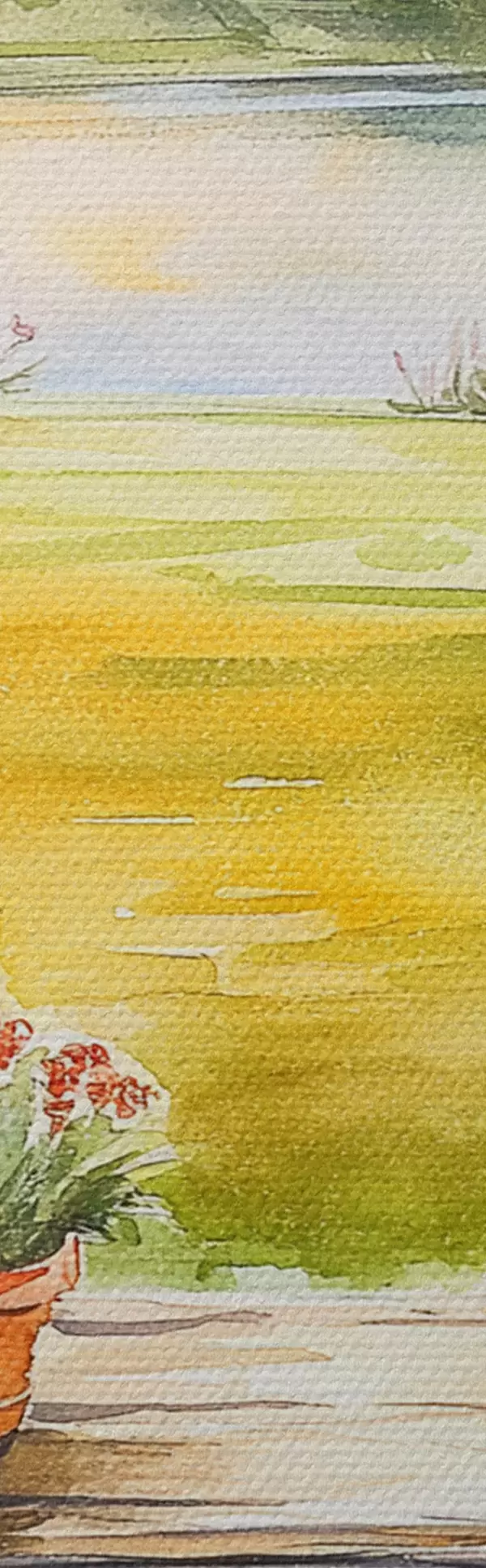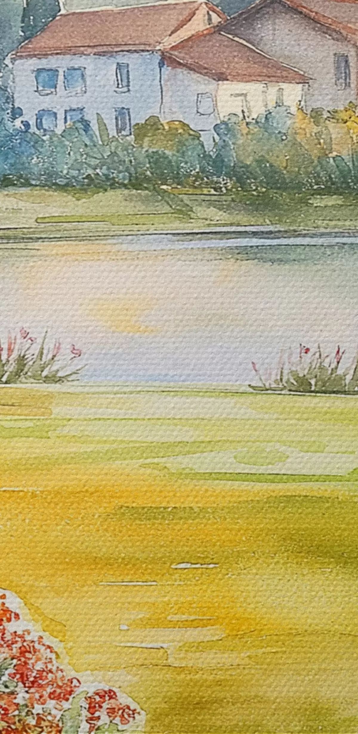 Immagine Villaggio al tramonto, rustico, fiori estivi, lago, stile acquerello Nr r44016