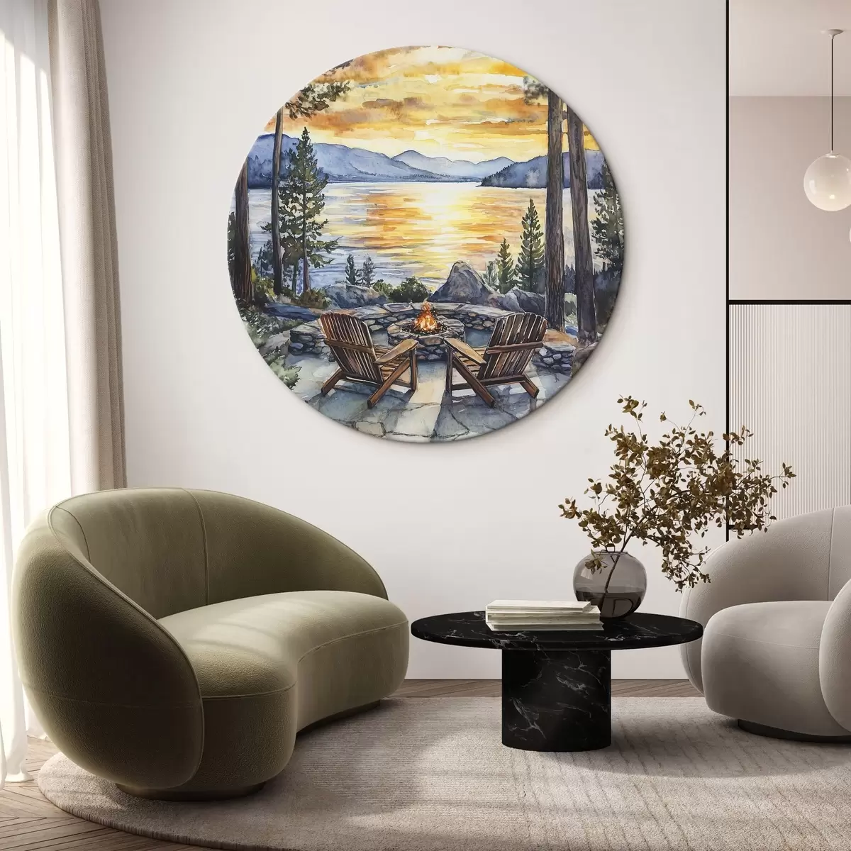 Quadri rotondi Lago con montagne al tramonto, viaggio, camino accogliente, acquerello r44018