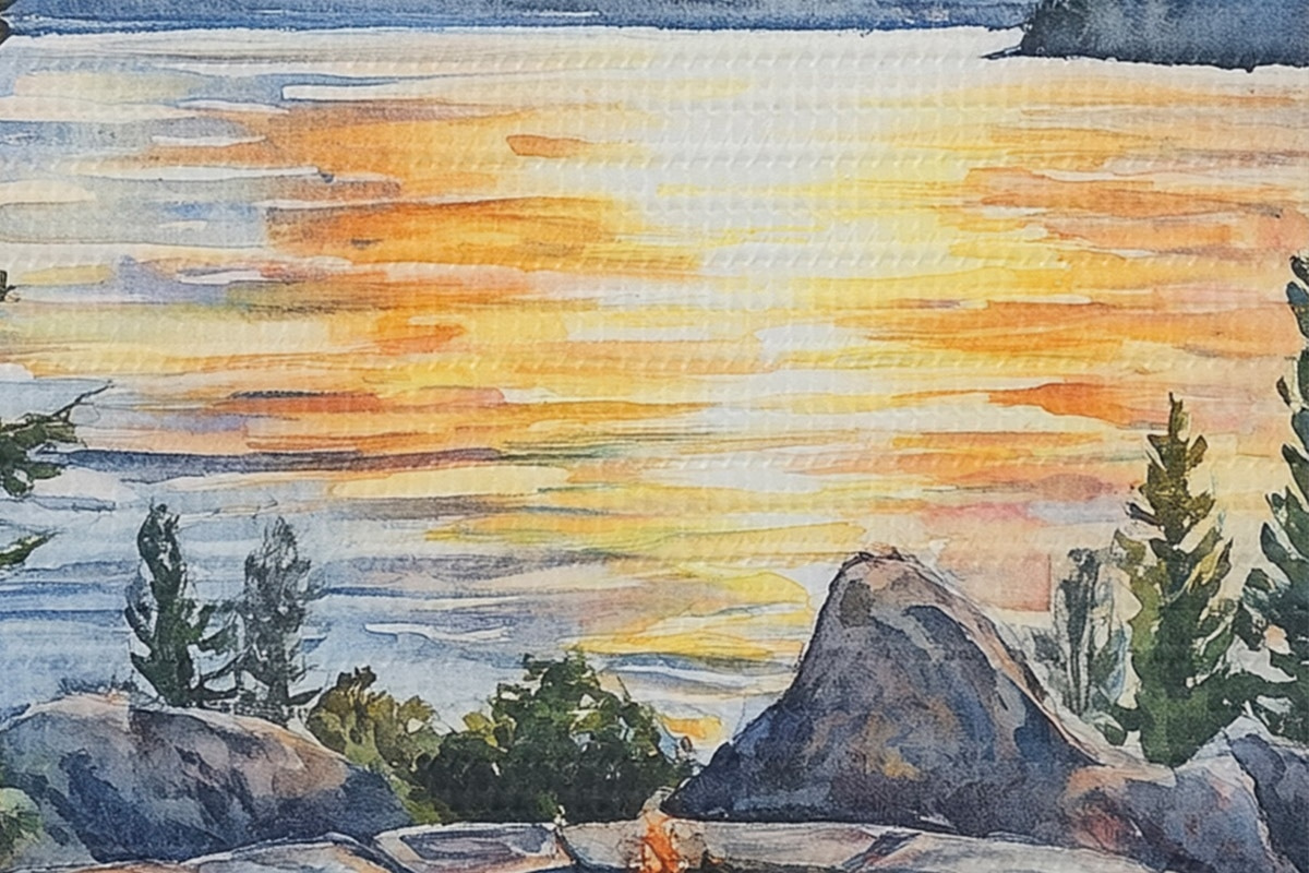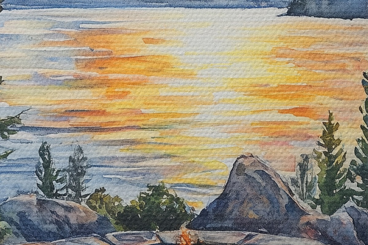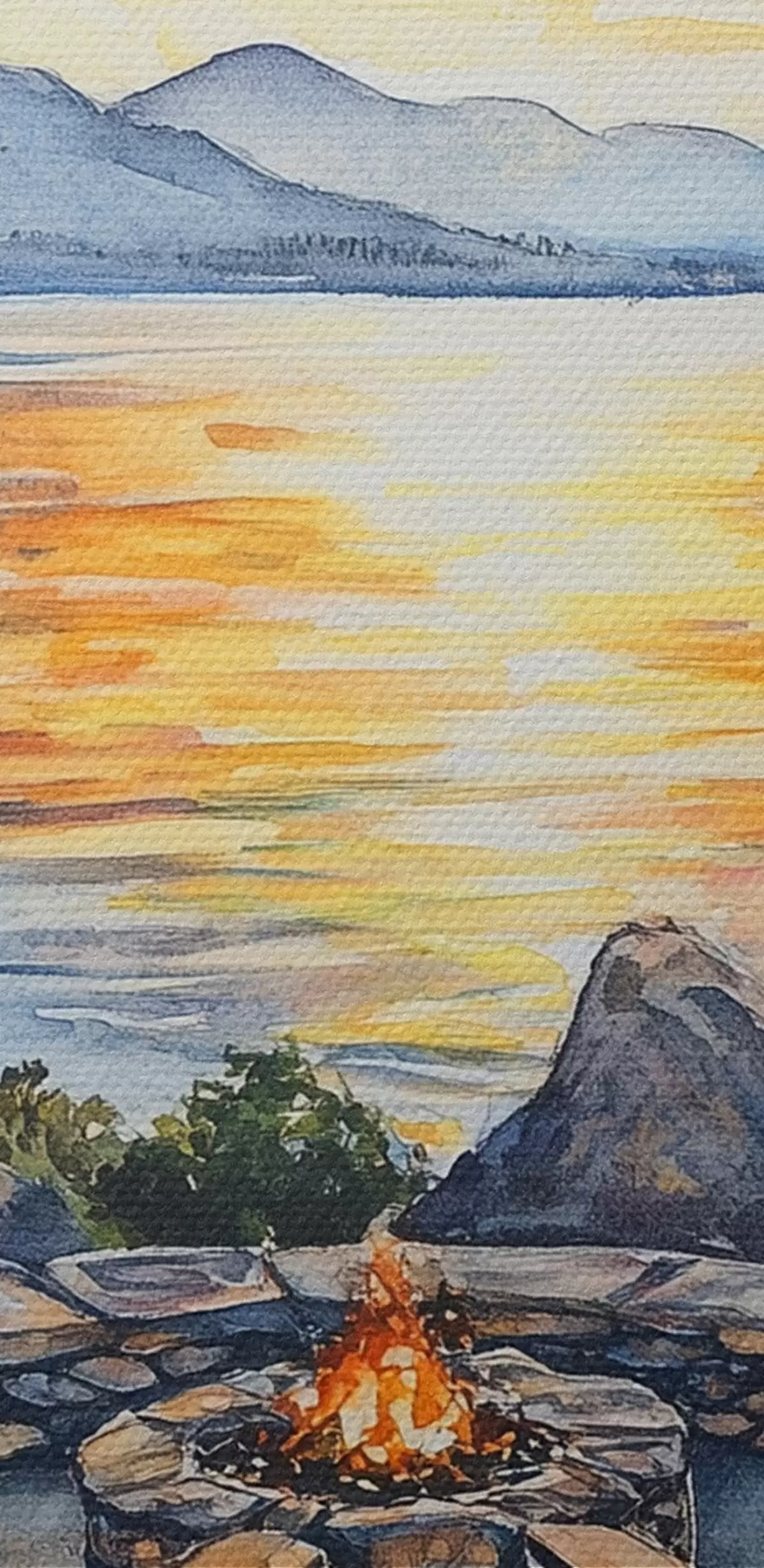 Immagine Lago con montagne al tramonto, viaggio, camino accogliente, acquerello Nr r44018