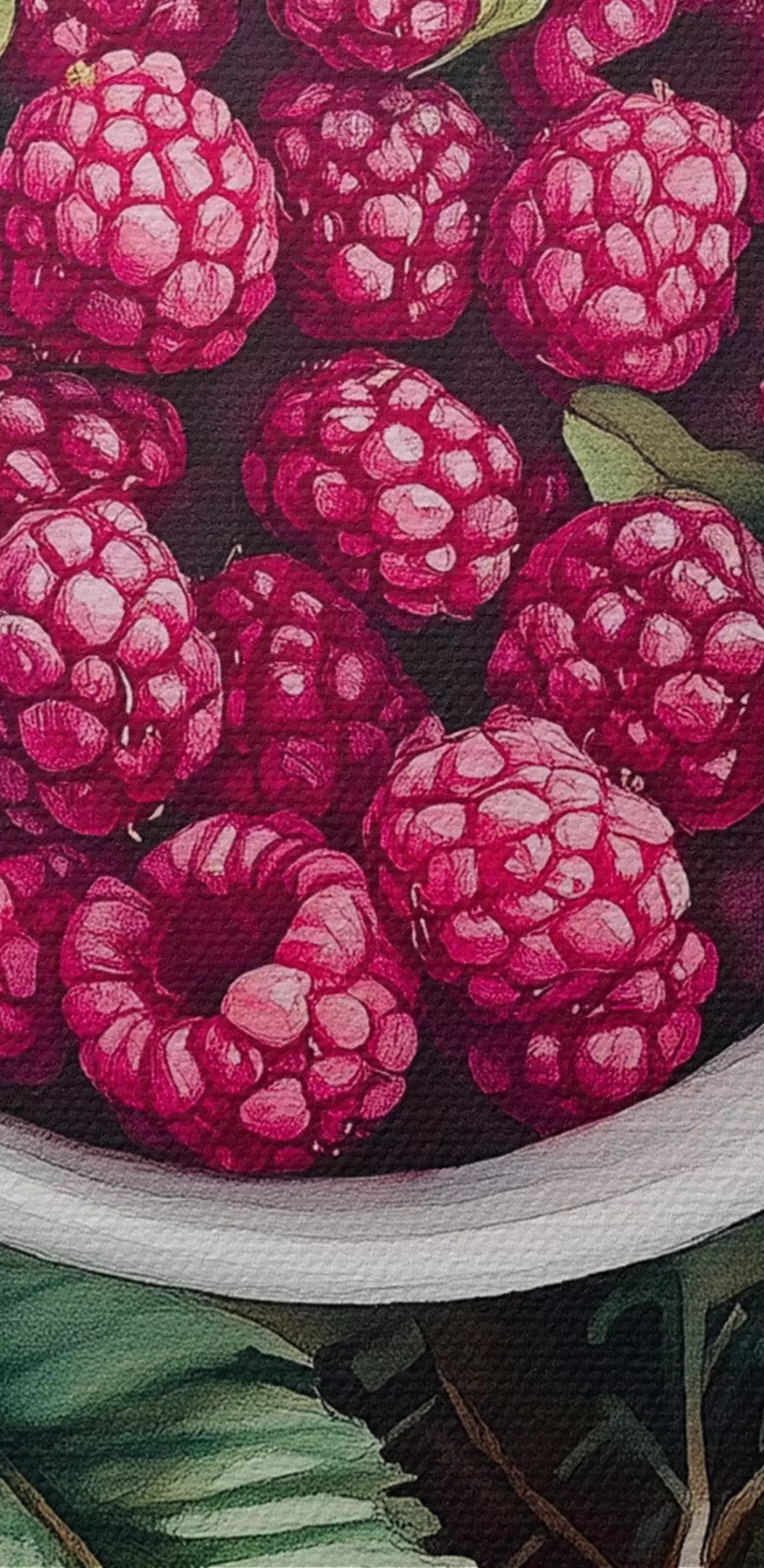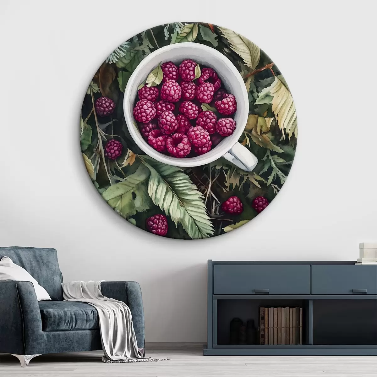 Quadri rotondi Lamponi succosi nel bosco, rustico, foglie, stile acquerello r44023