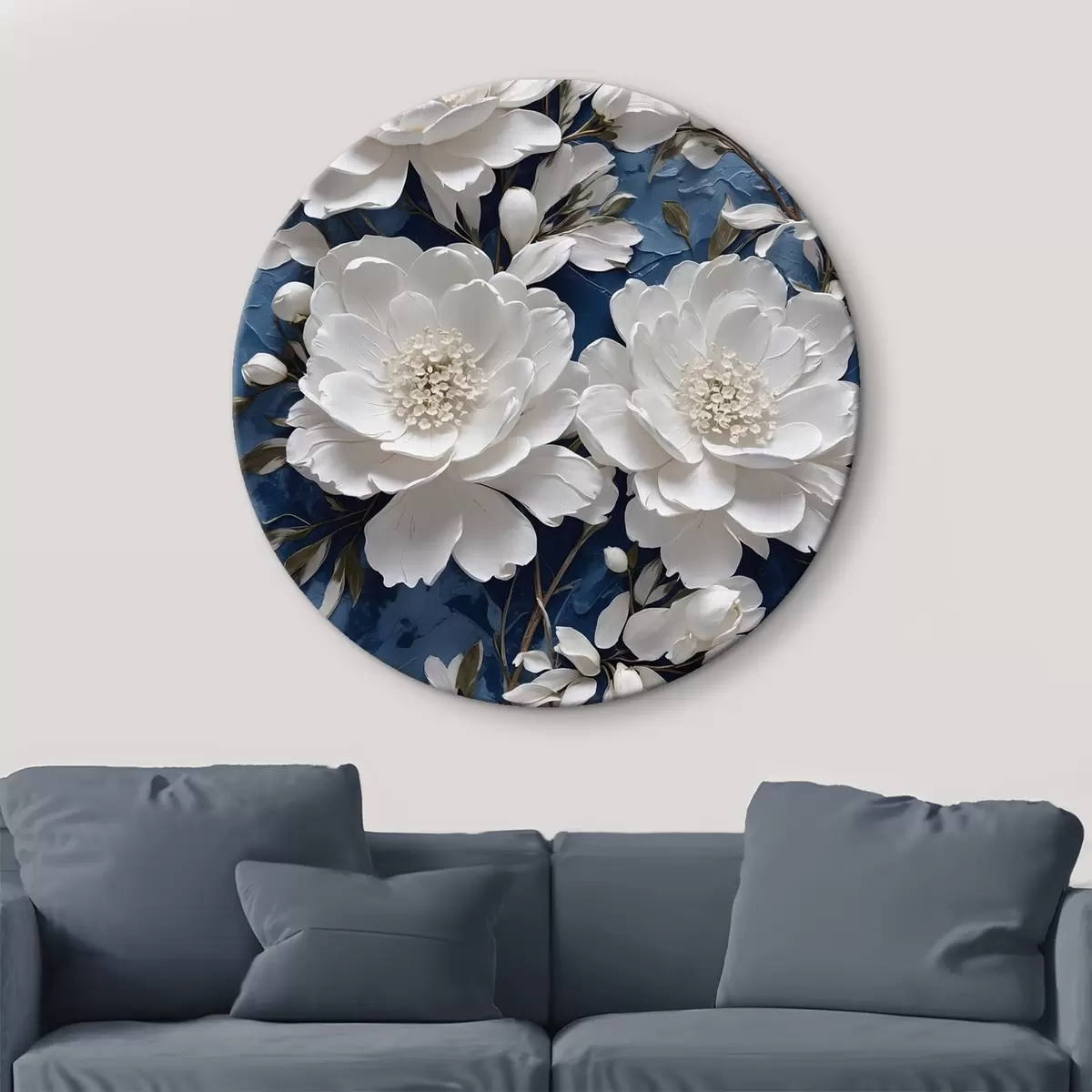Quadri rotondi Fiori bianchi su sfondo blu dipinto ad olio r44091