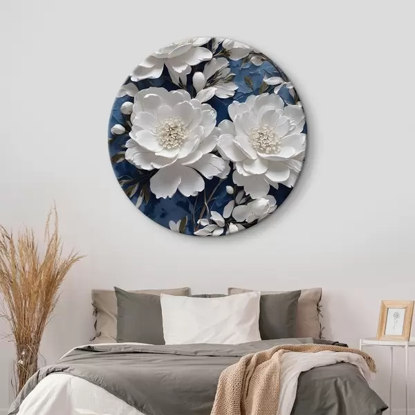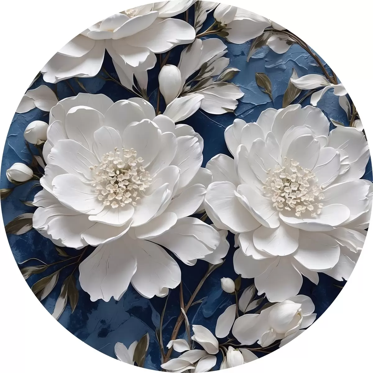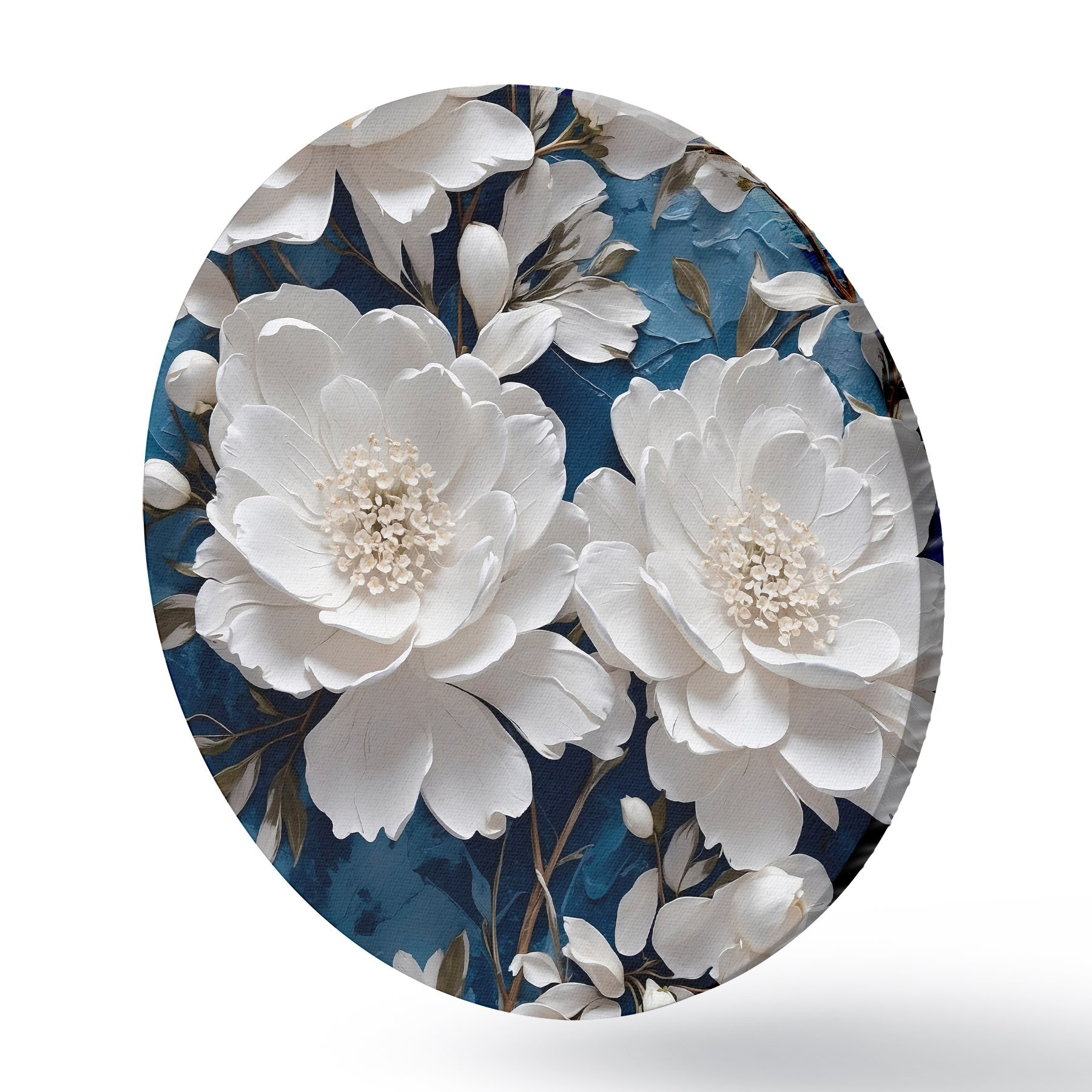 Quadri rotondi Fiori bianchi su sfondo blu dipinto ad olio r44091