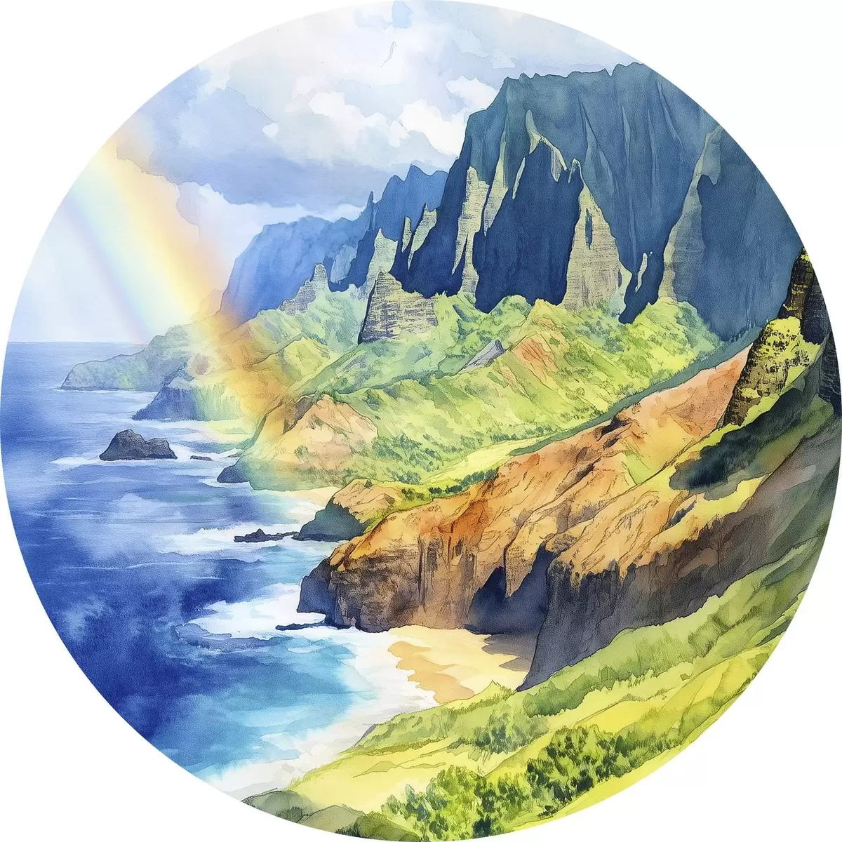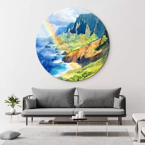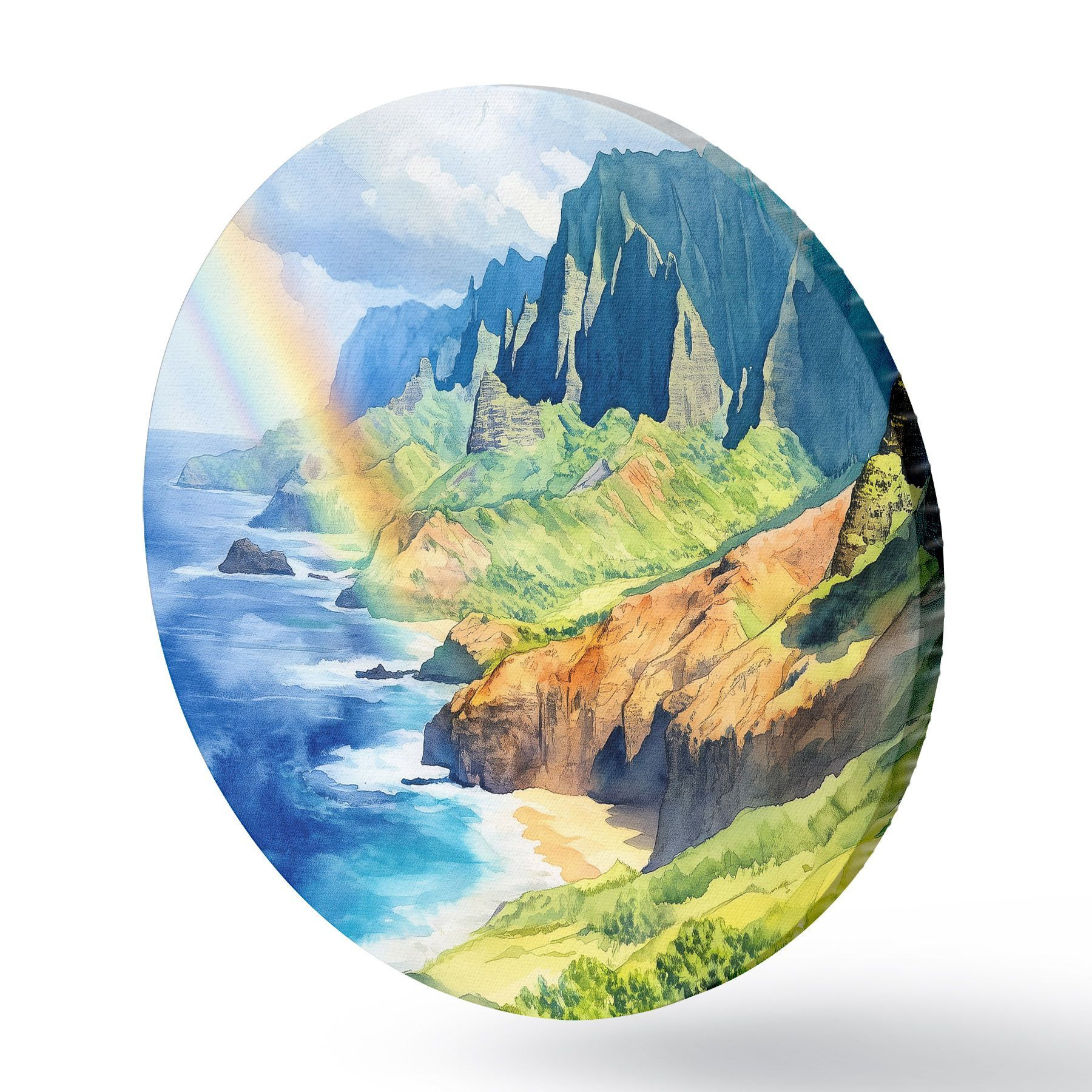 Quadri rotondi Isola delle Hawaii, stile acquerello, arcobaleno, montagne verdi, oceano r44141