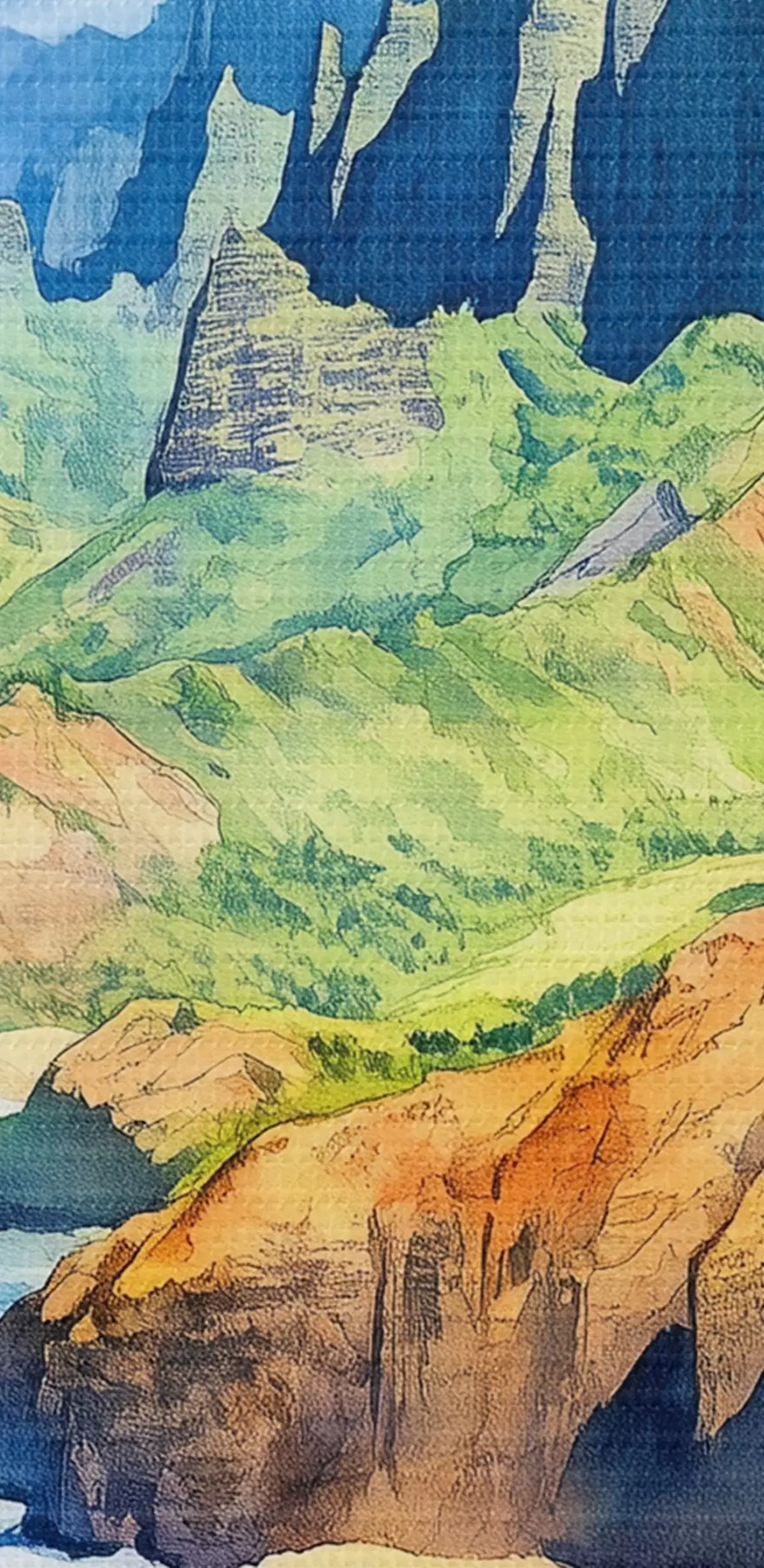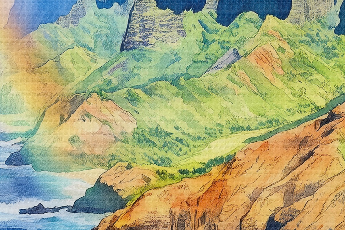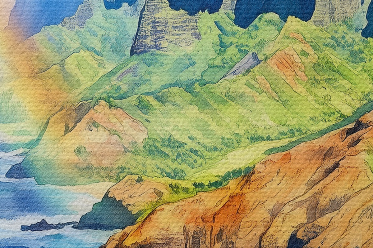 Immagine Isola delle Hawaii, stile acquerello, arcobaleno, montagne verdi, oceano Nr r44141