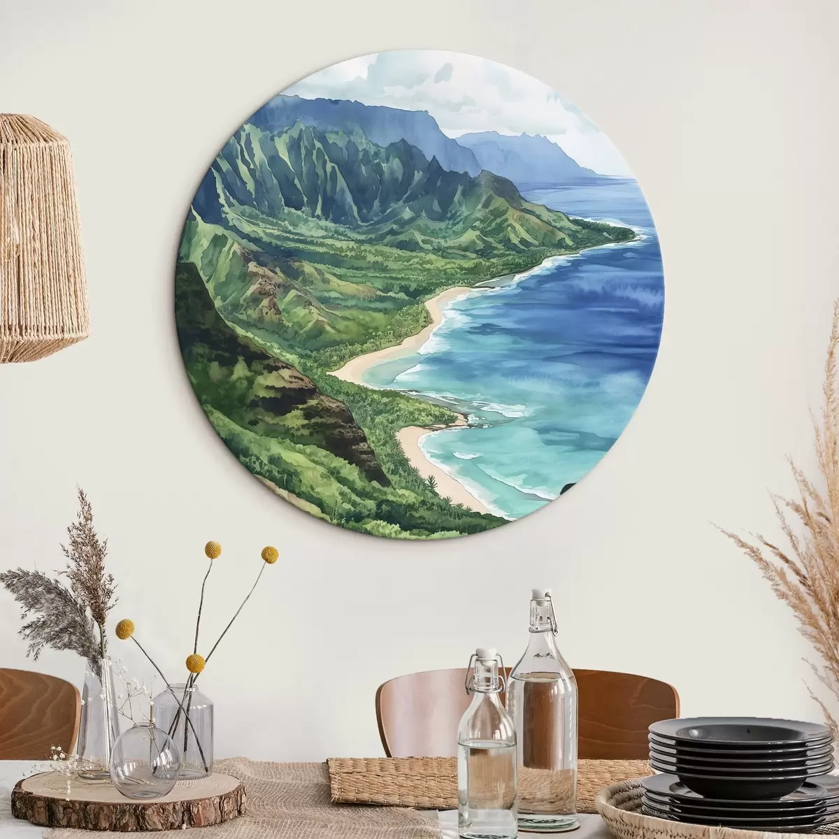 Quadri rotondi Montagne verdi, Hawaii, oceano, tropicale, acquerello r44143