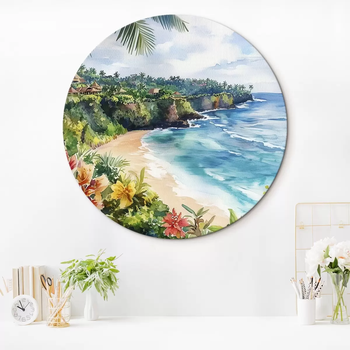 Quadri rotondi Spiaggia oceanica tropicale, palme, fiori, stile acquerello r44145