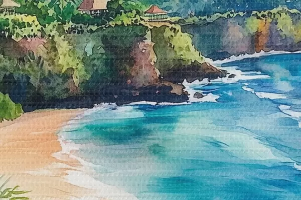 Immagine Spiaggia oceanica tropicale, palme, fiori, stile acquerello Nr r44145