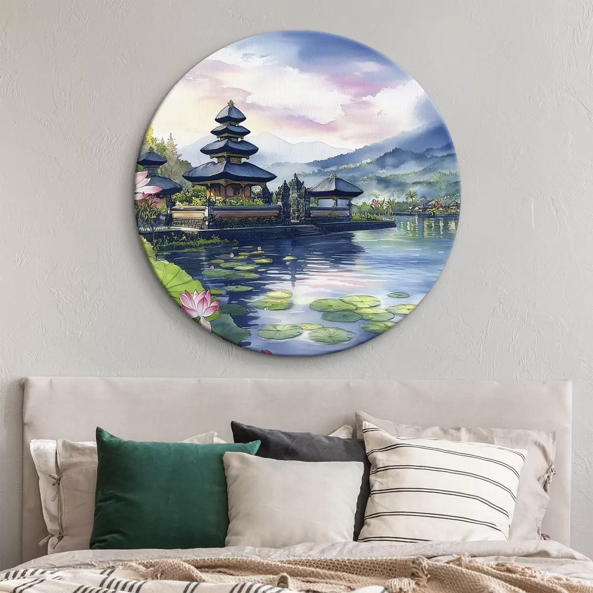 Quadri rotondi Isola indonesiana, tempio, buddismo, natura tropicale, stile acquerello r44148