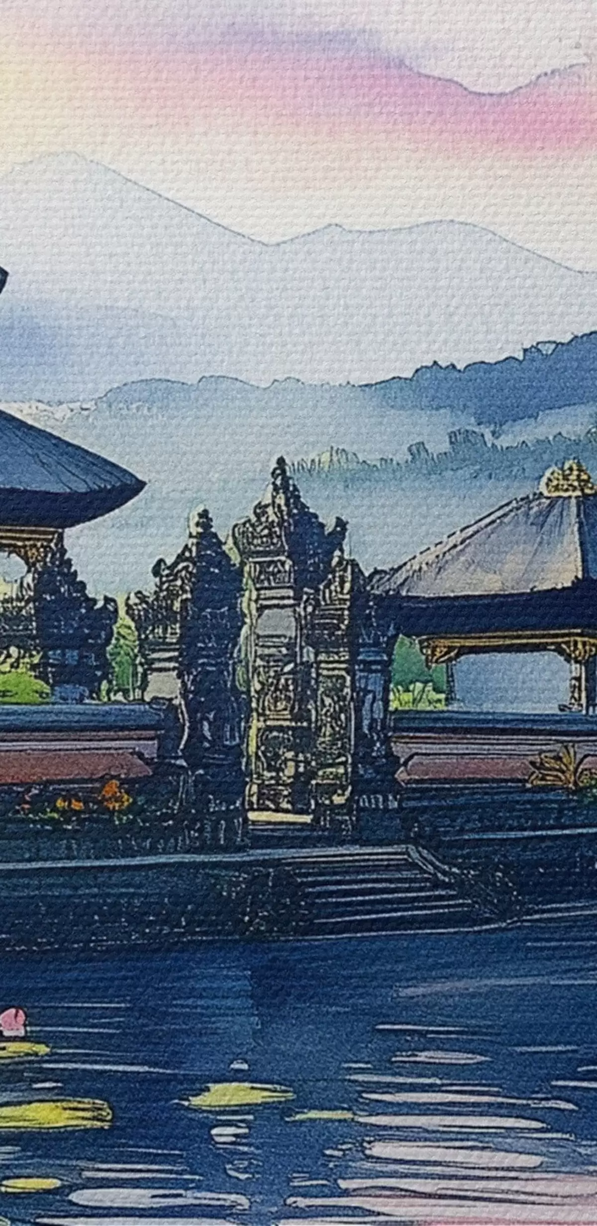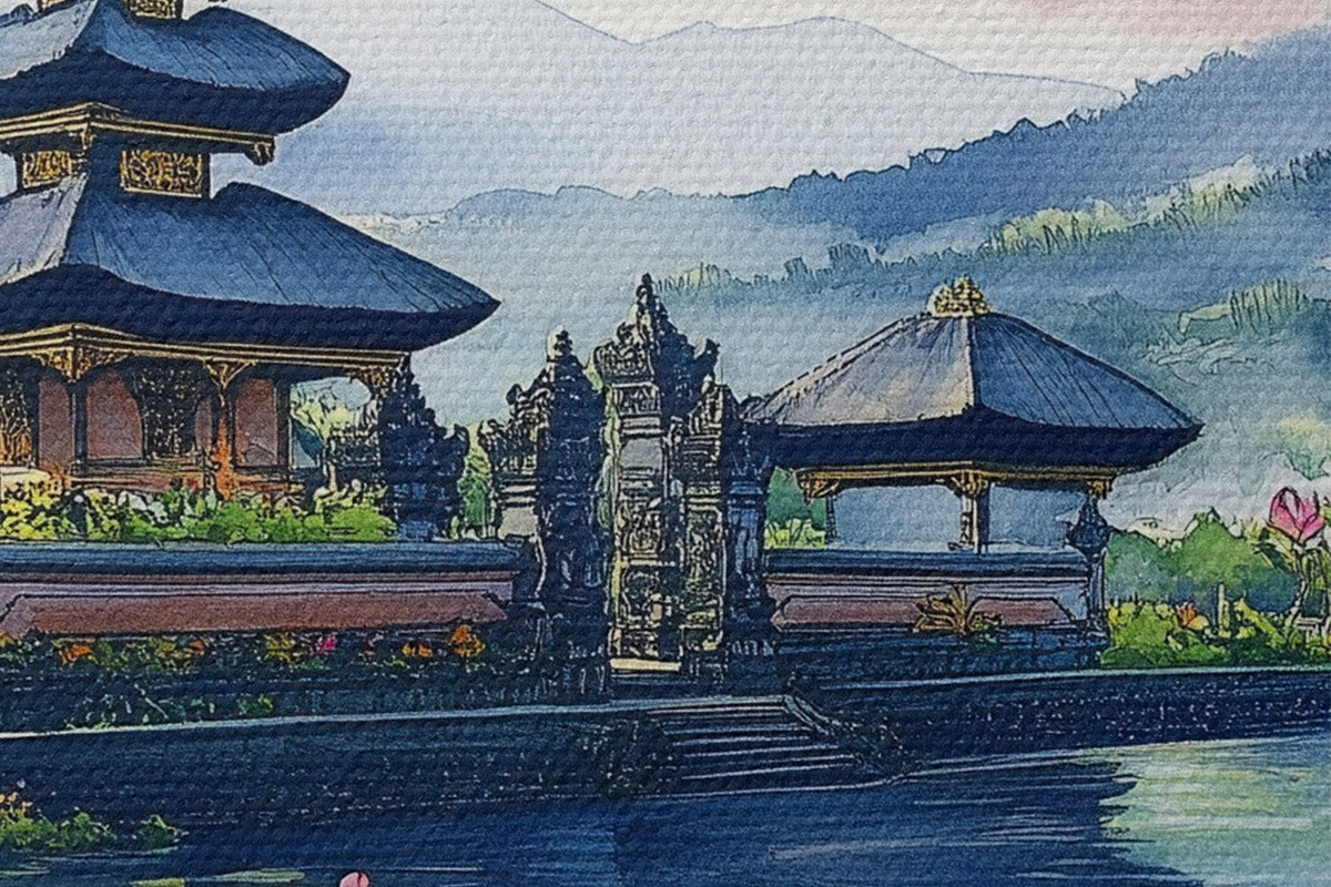 Immagine Isola indonesiana, tempio, buddismo, natura tropicale, stile acquerello Nr r44148