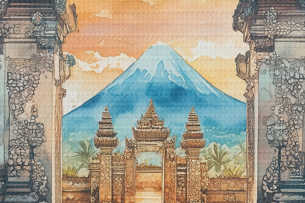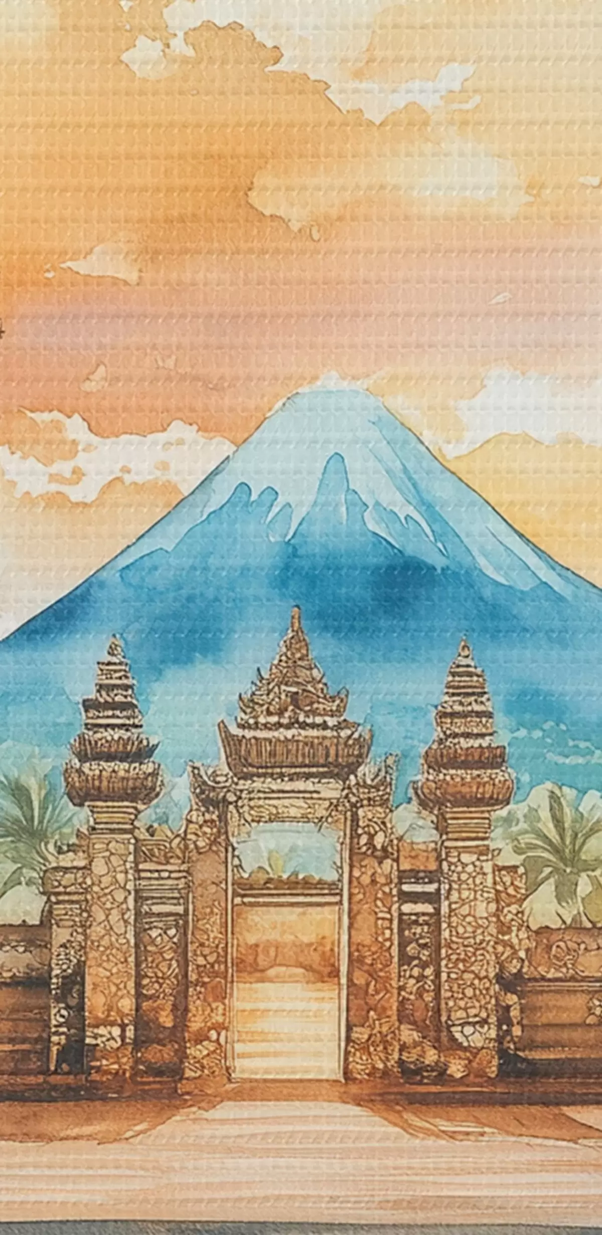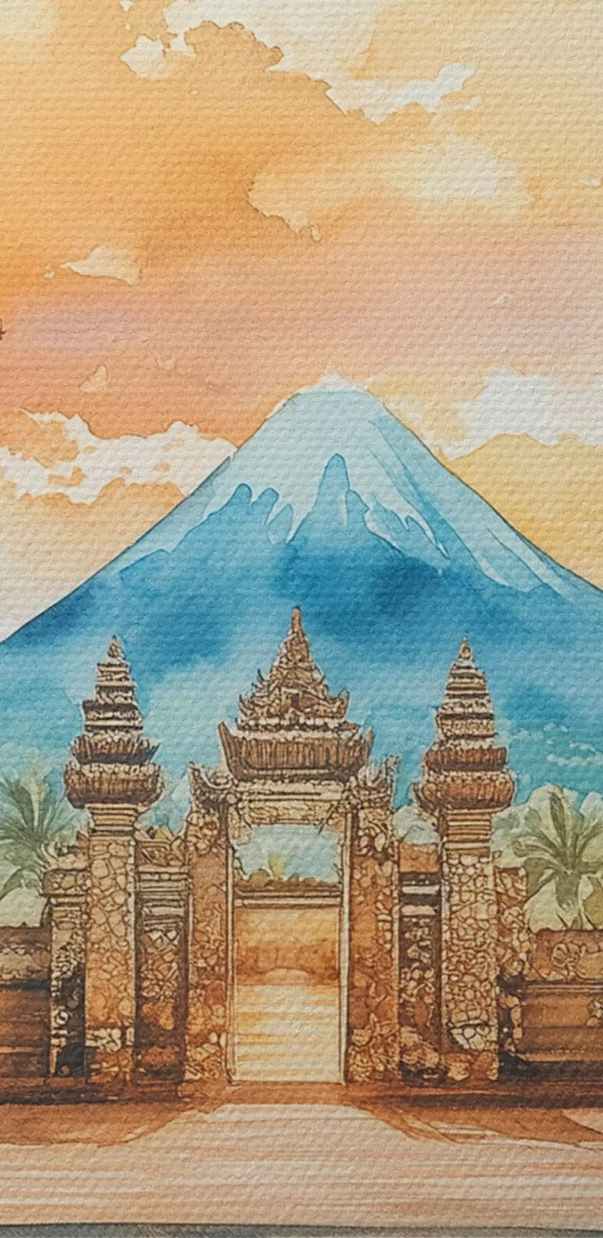 Immagine Estetica di Bali, tempio, cielo al tramonto, natura tropicale, stile acquerello Nr r44149