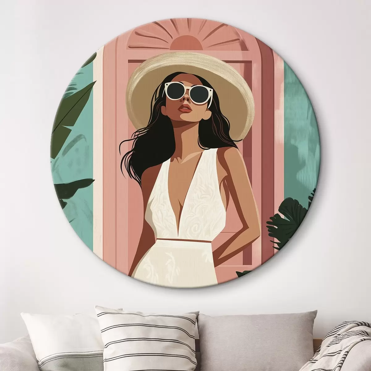 Quadri rotondi Donna con occhiali da sole e cappello, natura tropicale, architettura r44152
