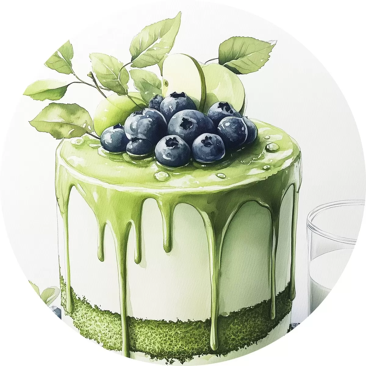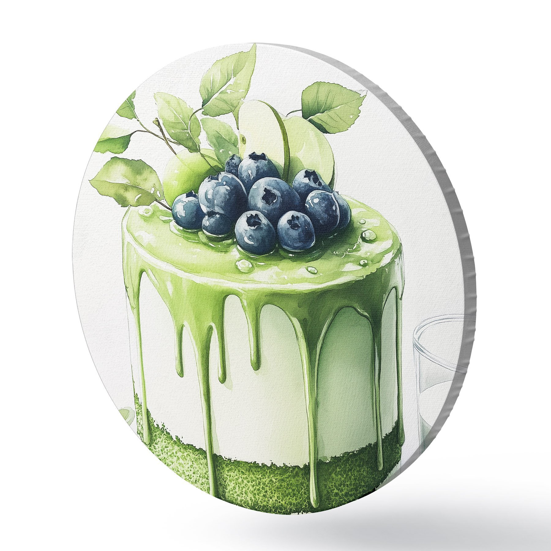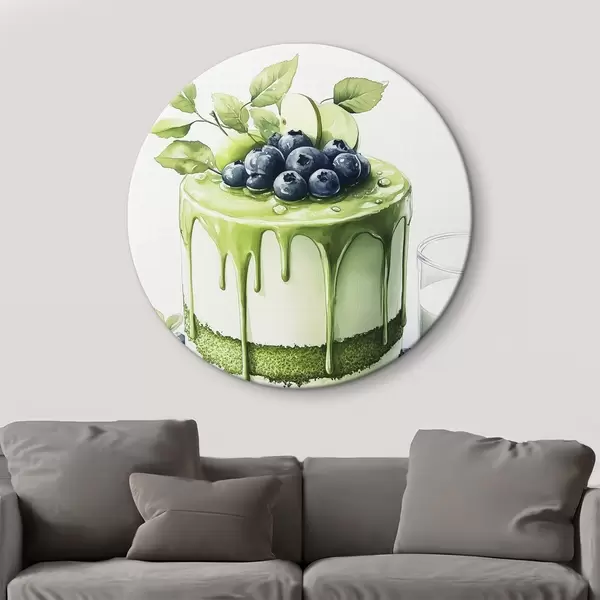 Quadri rotondi Torta Matcha con mirtilli e mele, stile acquerello r44304