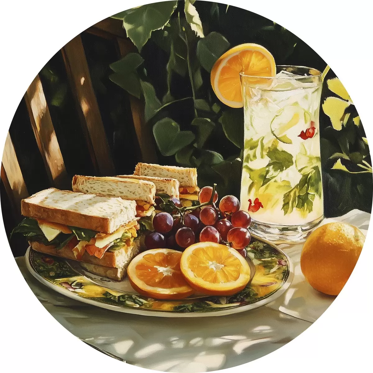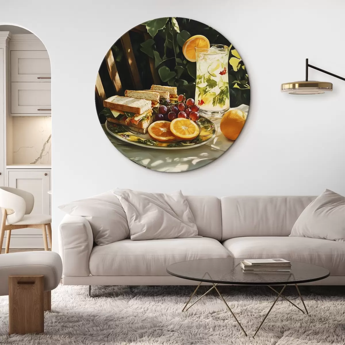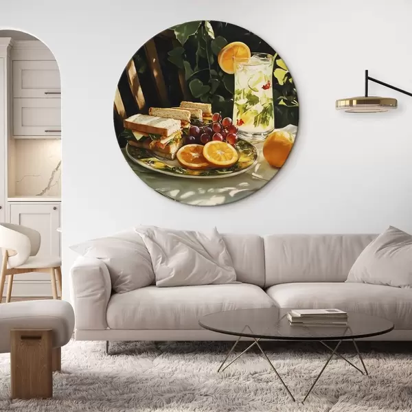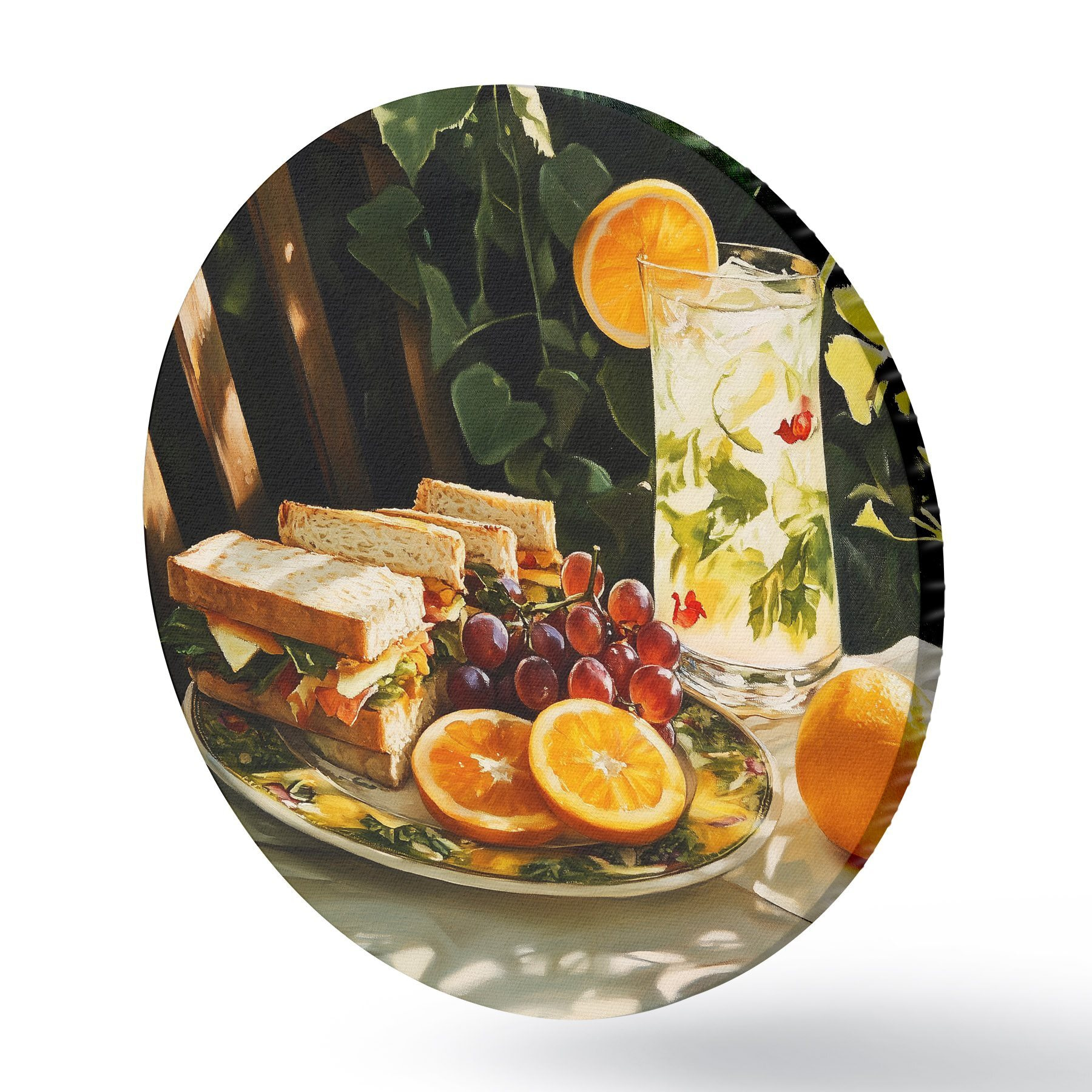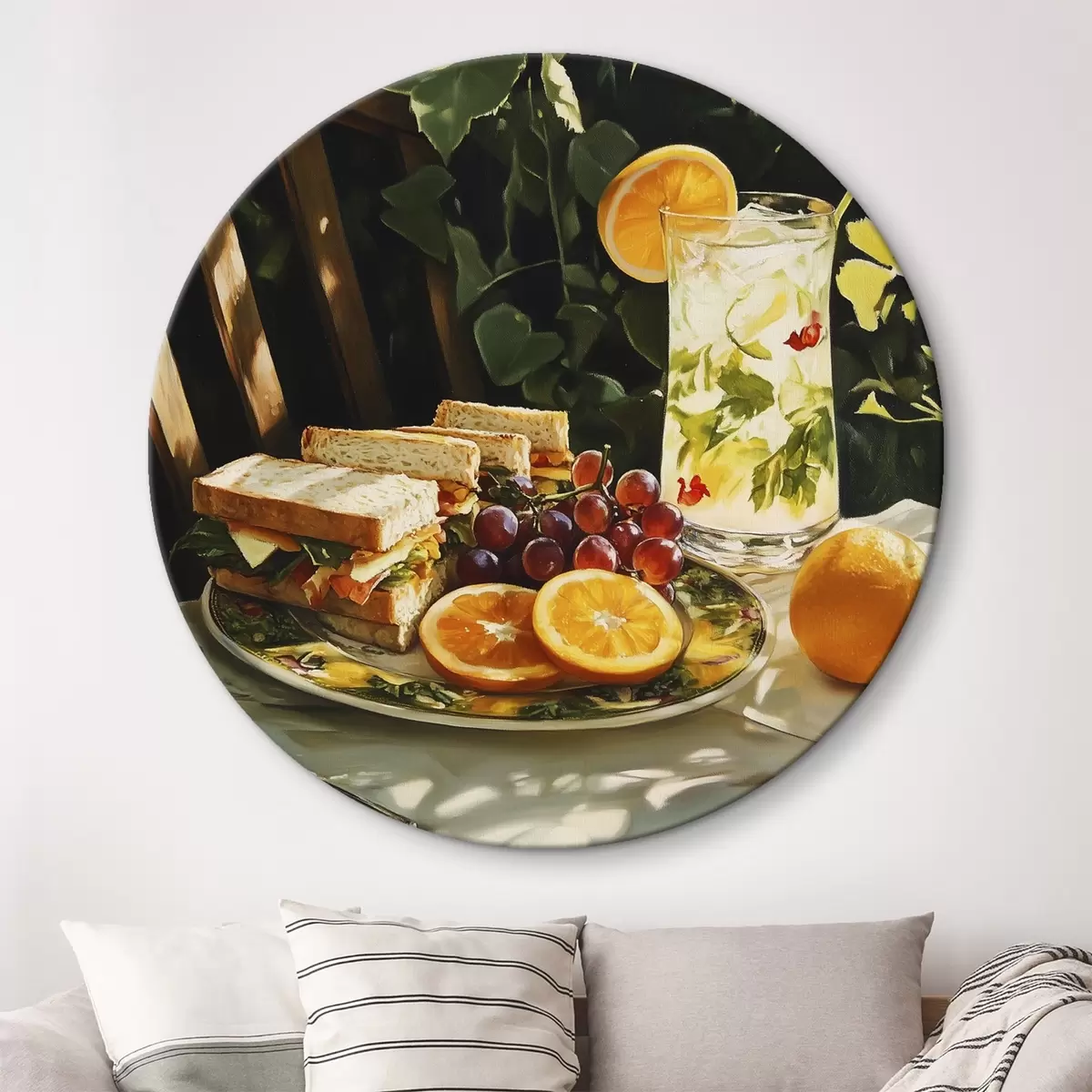 Quadri rotondi Picnic estetico nel giardino estivo, panini, arance e limonata r44306