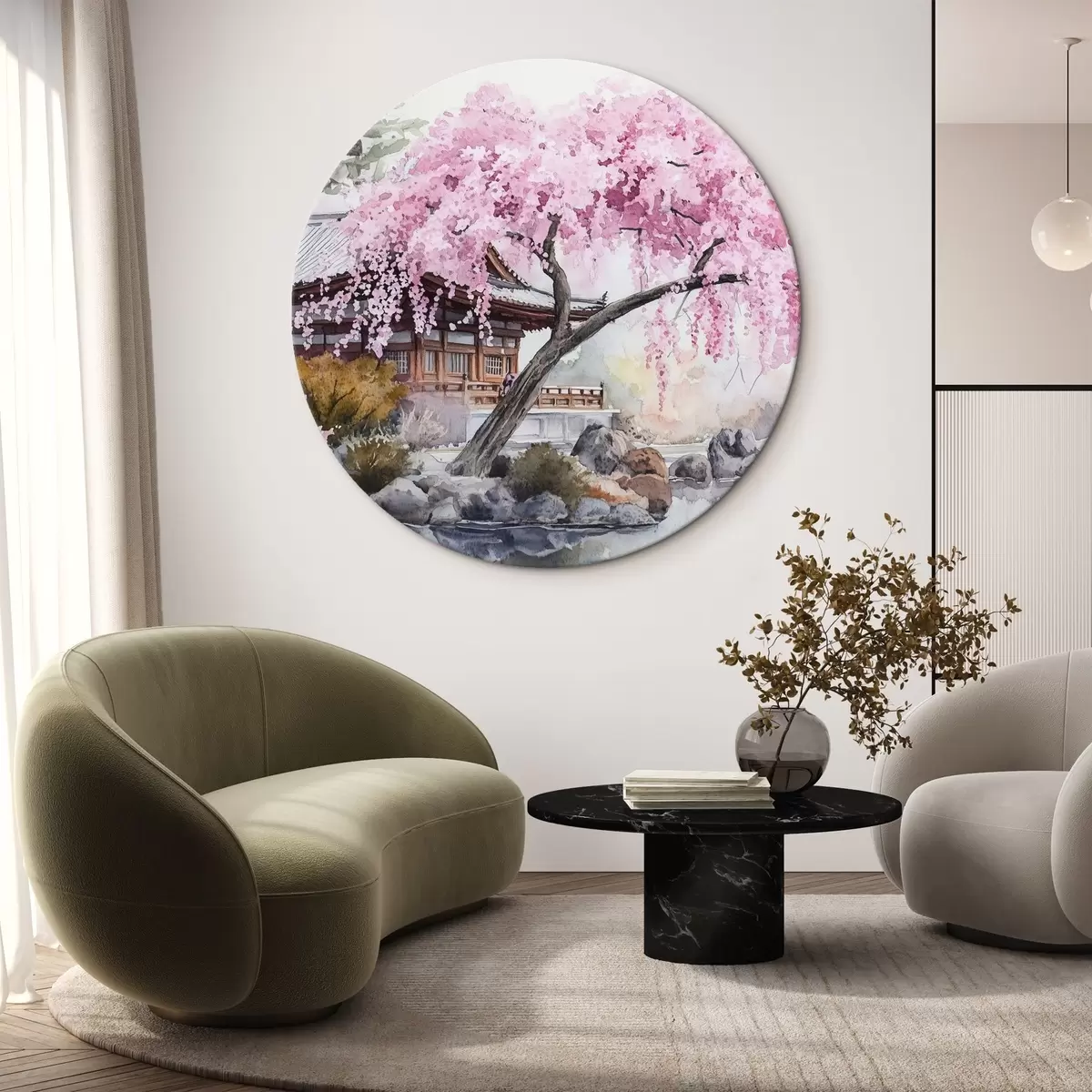 Quadri rotondi Albero di ciliegio rosa vicino alla casa sul lago, Giappone, stile orientale, acquerello r44312