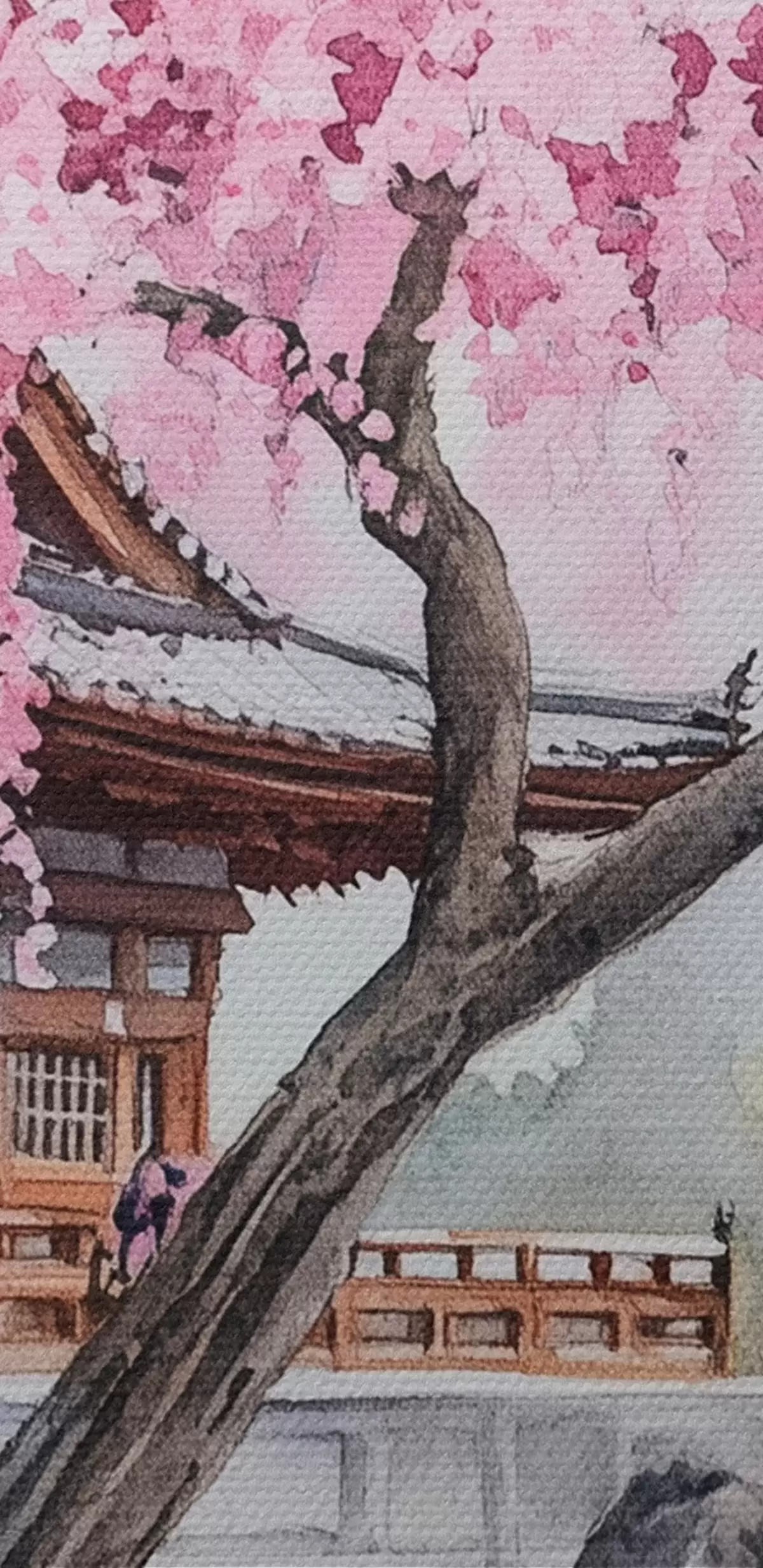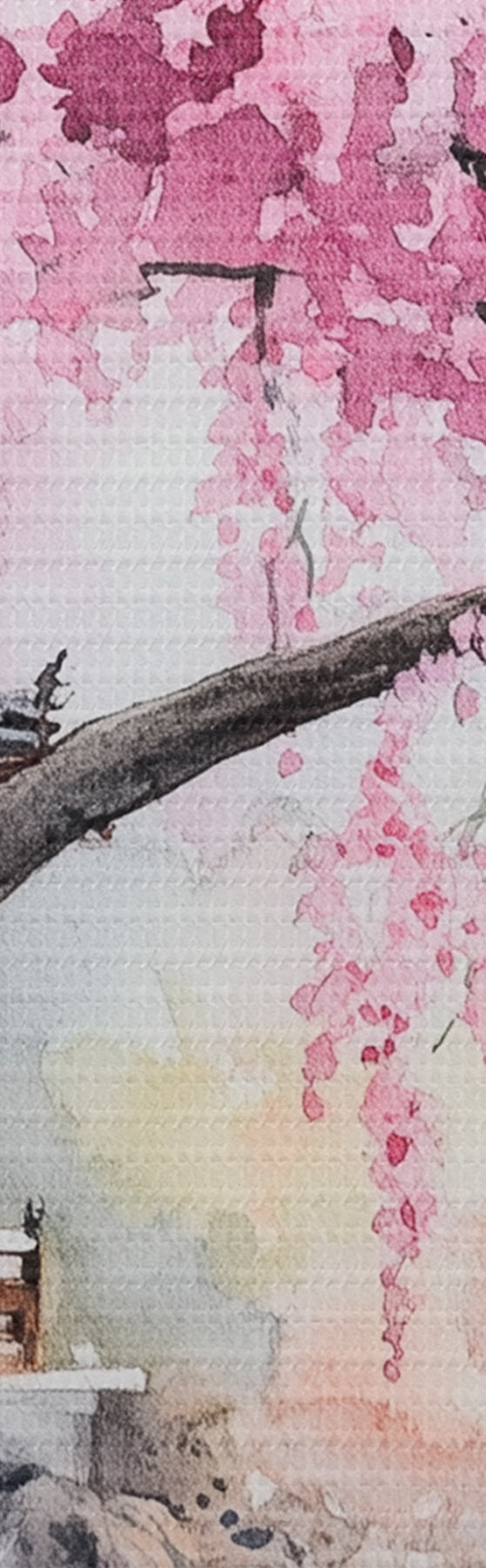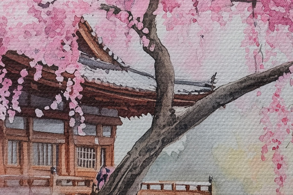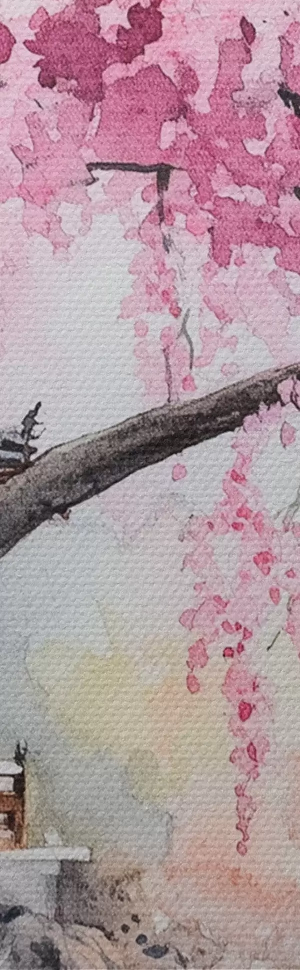 Immagine Albero di ciliegio rosa vicino alla casa sul lago, Giappone, stile orientale, acquerello Nr r44312