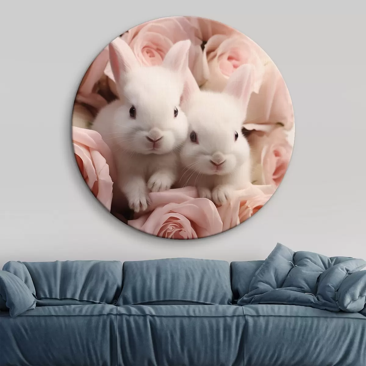 Quadri rotondi Due conigli bianchi tra delicati fiori di rosa r44380